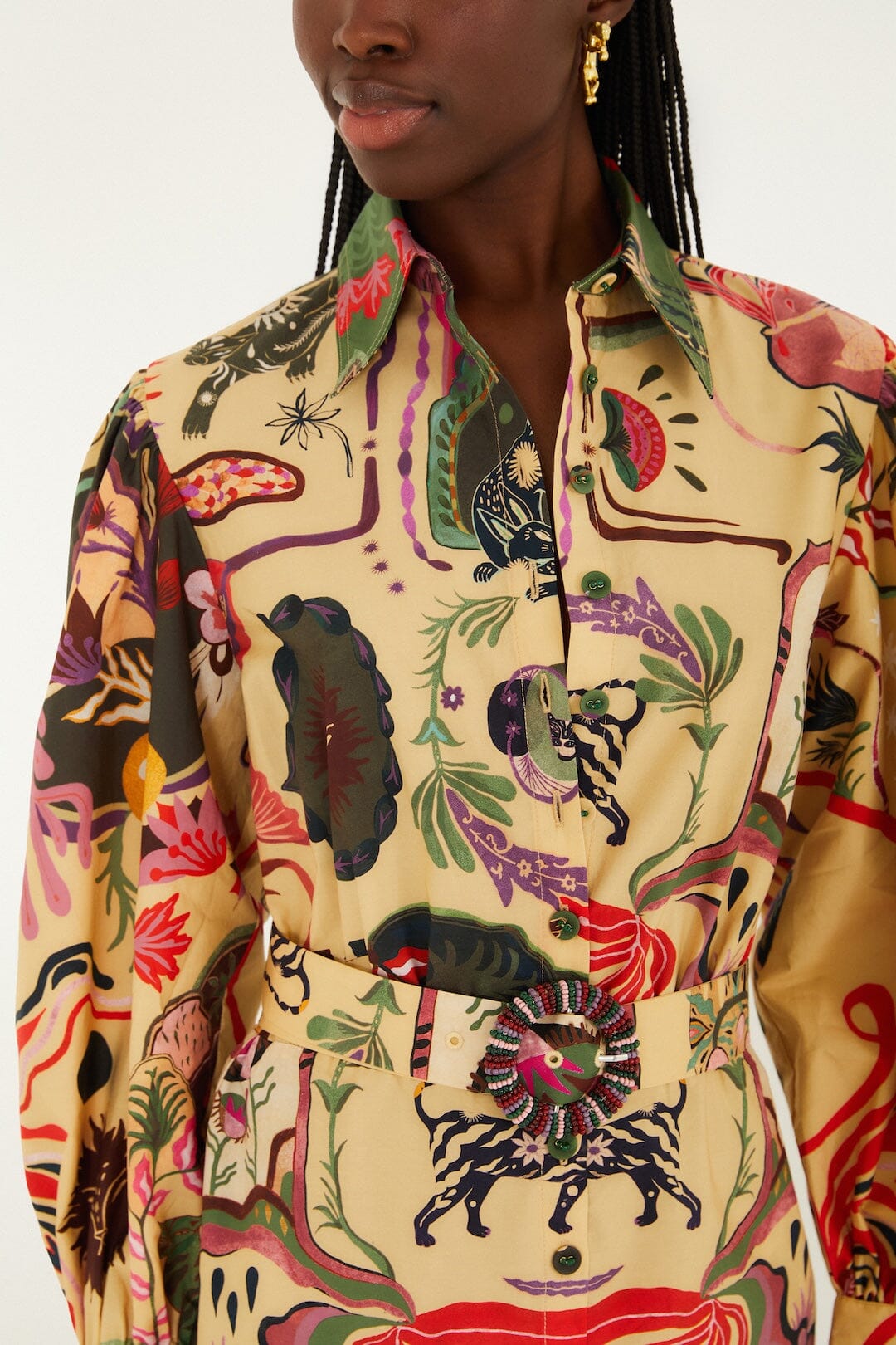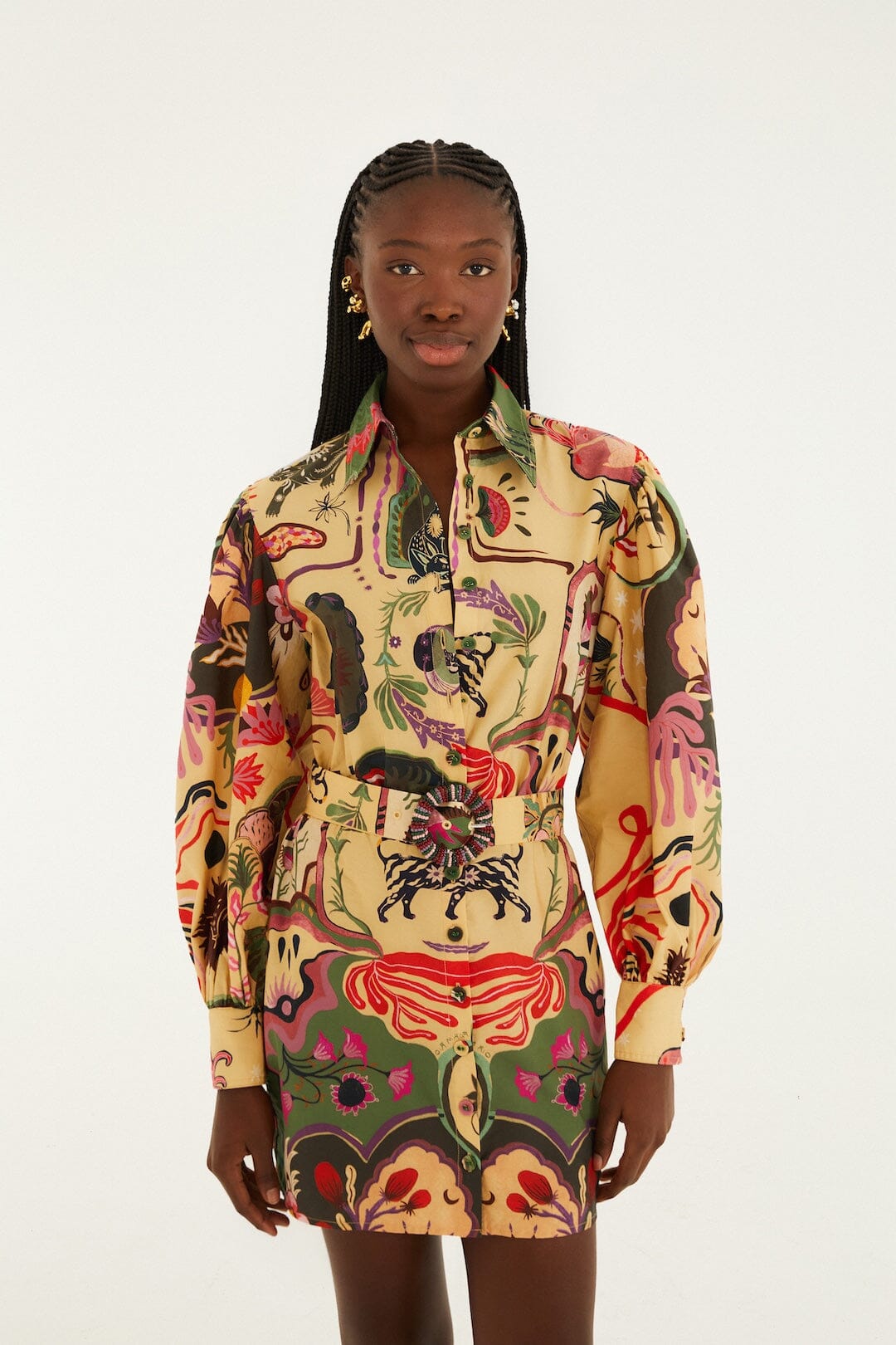 Embrace effortless charm with the Beige Artsy Surreal Land Beaded Belt Organic Cotton Mini Dress from FARM Rio. This playful piece features a soft beige canvas adorned with vibrant surreal patterns that celebrate nature’s whimsy. The structured collar neckline adds a touch of sophistication, while the beaded belt cinches the waist, creating a flattering silhouette. Crafted from organic cotton, it offers breathability and comfort, perfect for sunny days filled with joyful adventures.