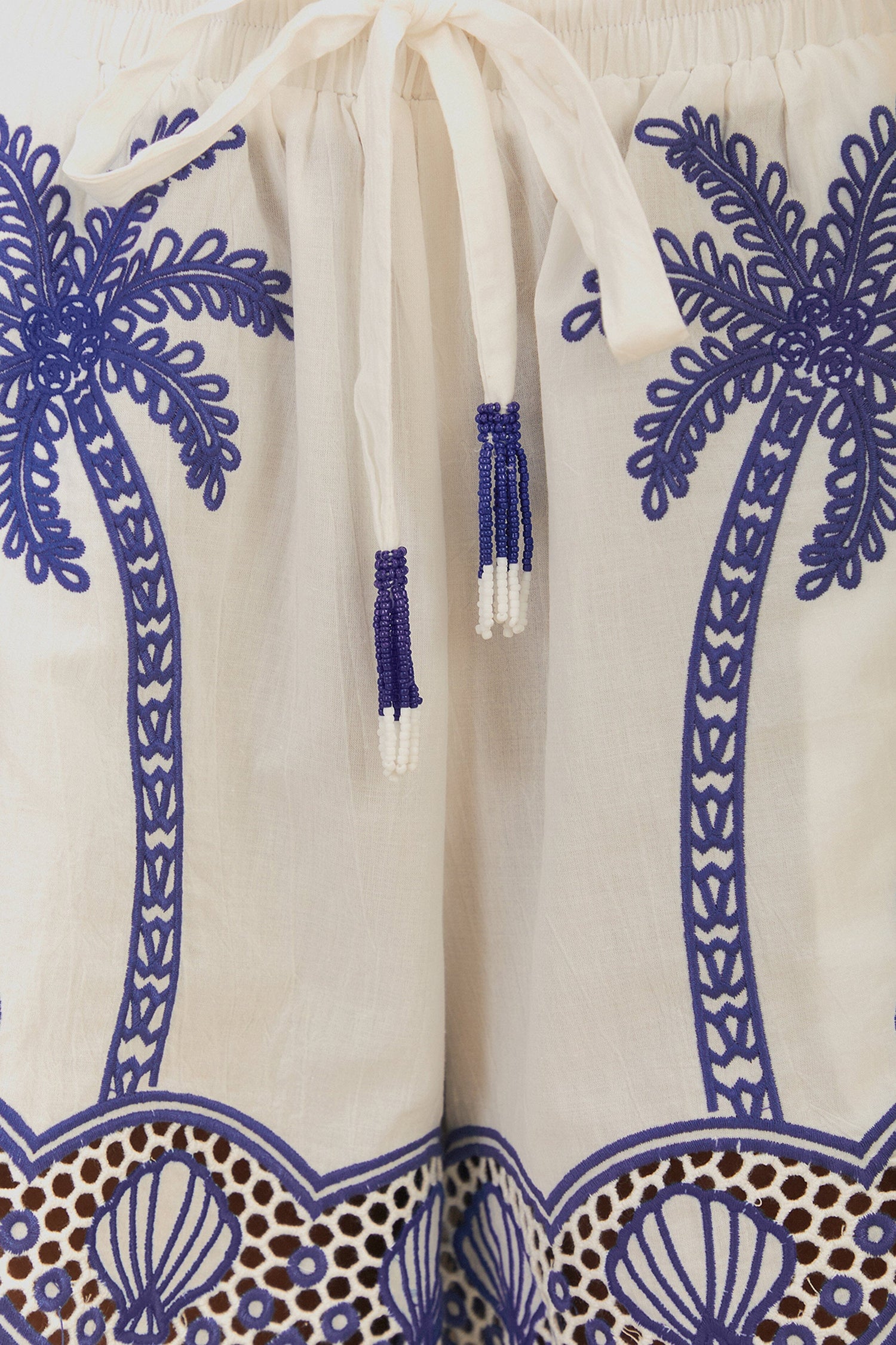 Embrace tropical charm with the Blue Palm Trees Richelieu Short from FARM Rio. Featuring beautifully detailed blue embroidery of lush palm trees set against a crisp white background, these shorts capture the essence of carefree summer days. The intricate scalloped hem adds a touch of whimsy, making it a standout piece for any warm-weather adventure. Let playful elegance follow you wherever you roam.