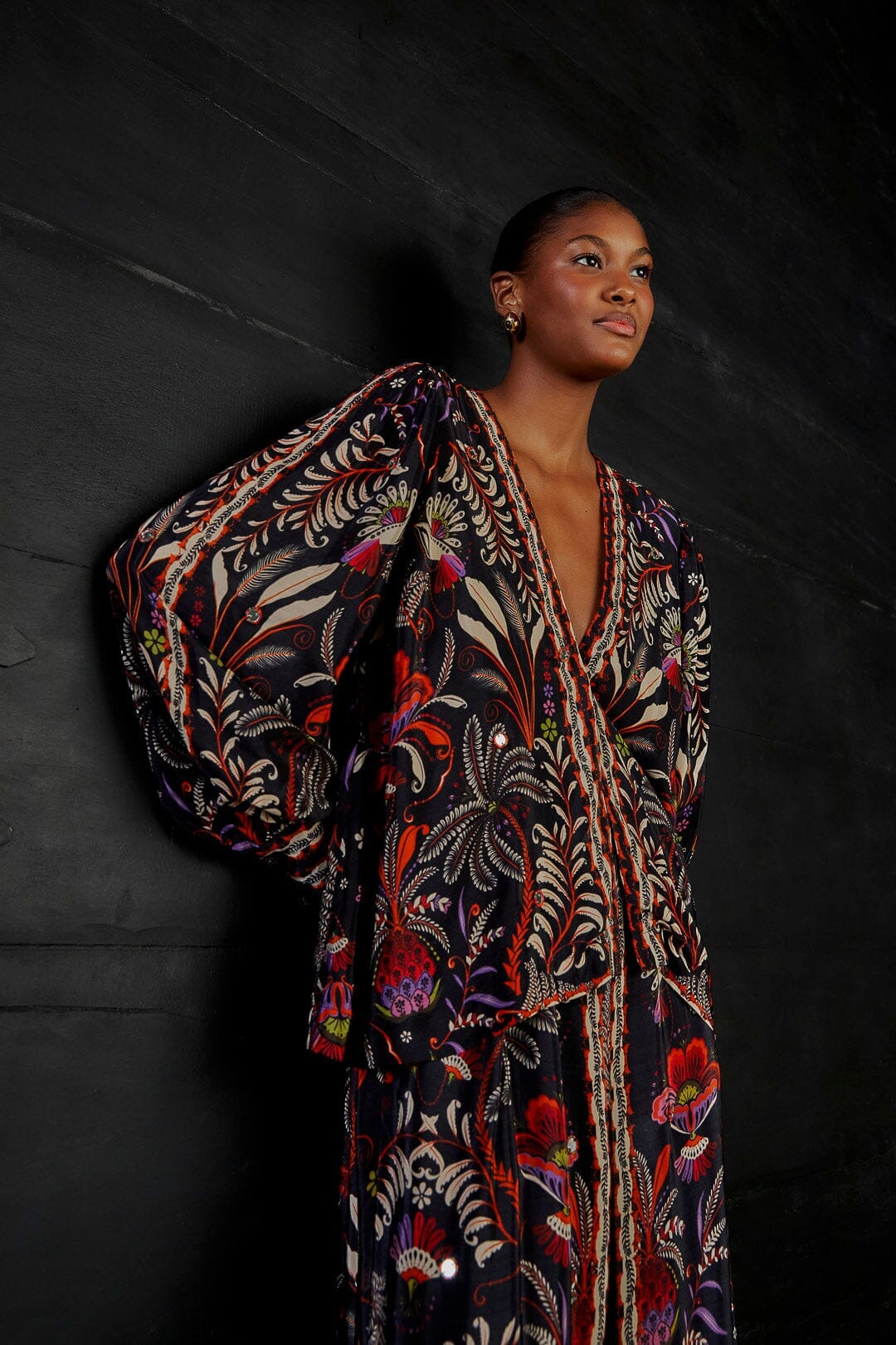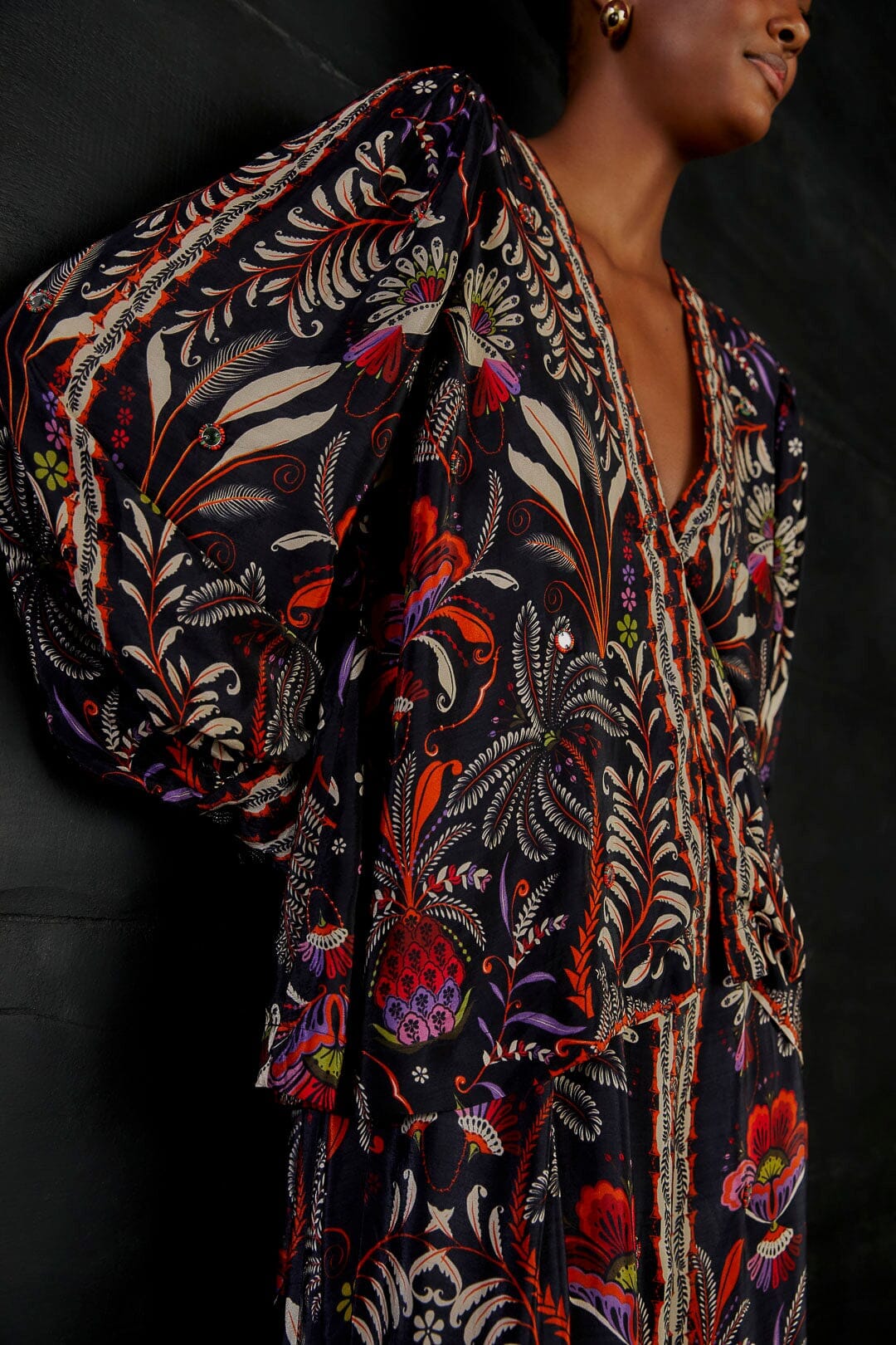What if our wardrobe served as a sweet reminder that every day, including the chilliest ones, calls for a warm welcome? That's the essence of our FW23 collection: say olá to pieces that add an unexpected twist to the Fall-Winter classics, inviting you to infuse the season with new colors, play around with style, and enjoy every little detail. You'll be ready to overcome Winter blues with an extra cup of wardrobe happiness that makes you smile even on the cloudiest days.Long sleeves Beaded mirror appliques Center-front button placket V neckline