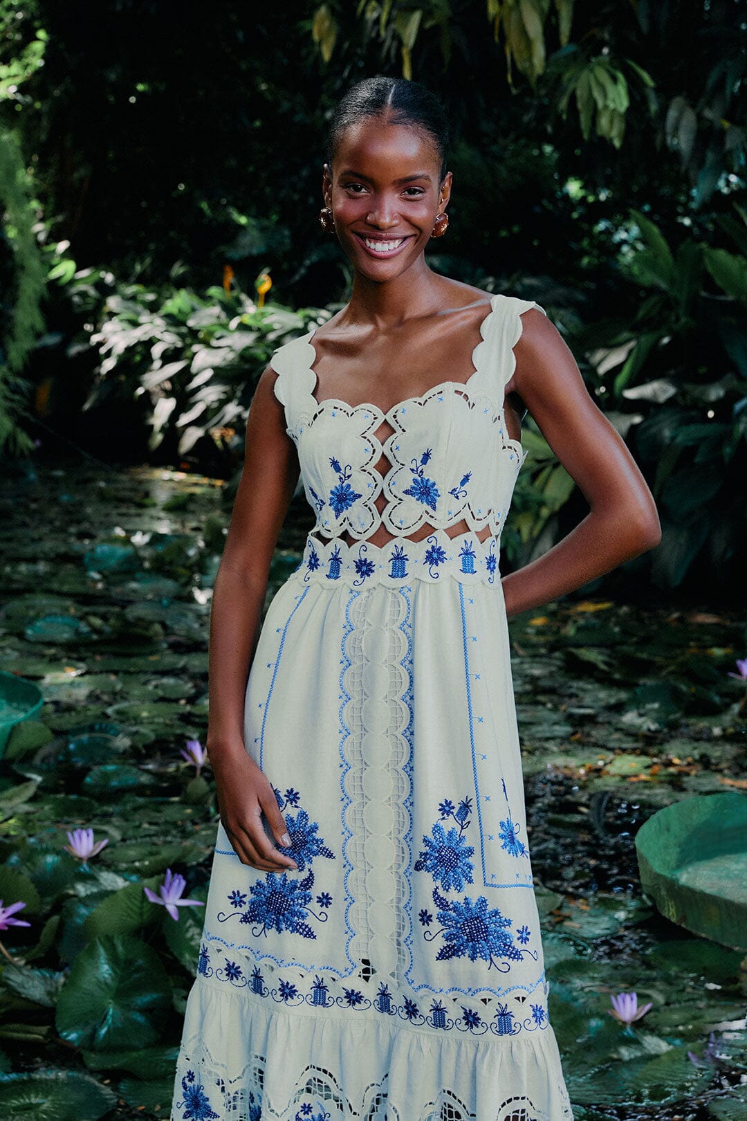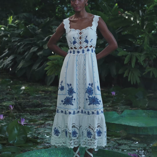 Step into a world of elegance with the Off-White Richelieu Sunflower LENZING™ ECOVERO™ Euroflax™ Midi Dress. This enchanting piece features intricate richelieu embroidery with vibrant blue floral patterns dancing gracefully against a soft off-white background. A playful V neckline and delicate scalloped straps add a touch of whimsy, while the dress flows into a midi silhouette. Crafted from responsible materials, this piece captures the essence of effortless charm.