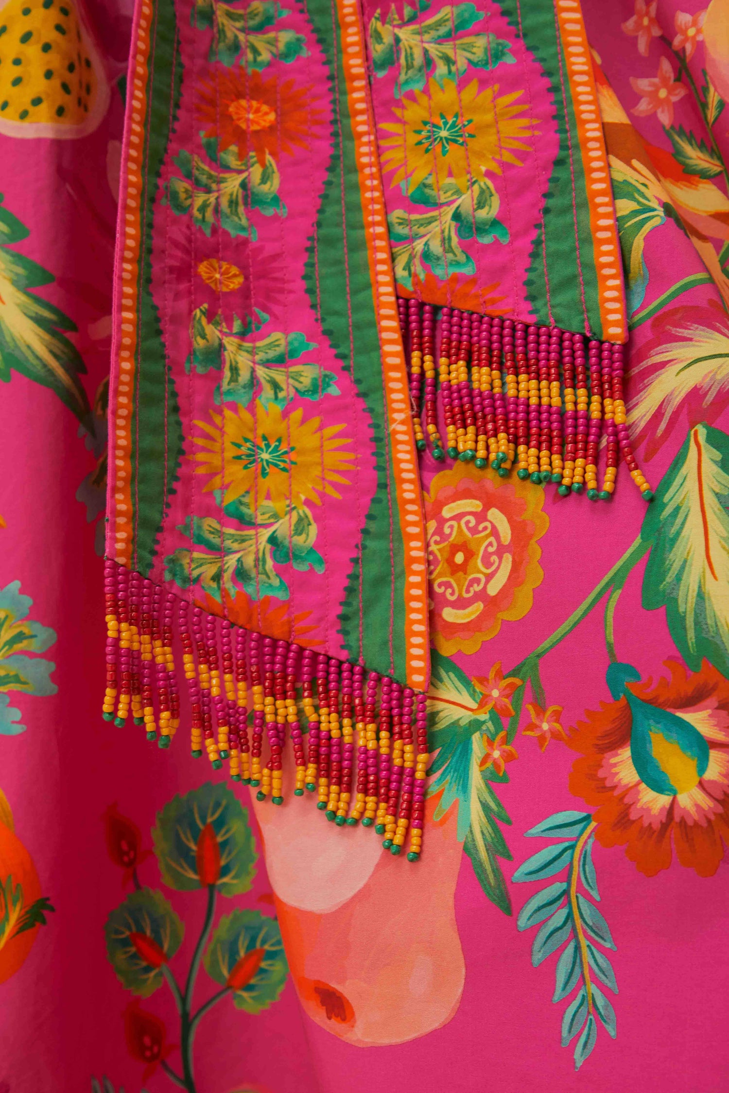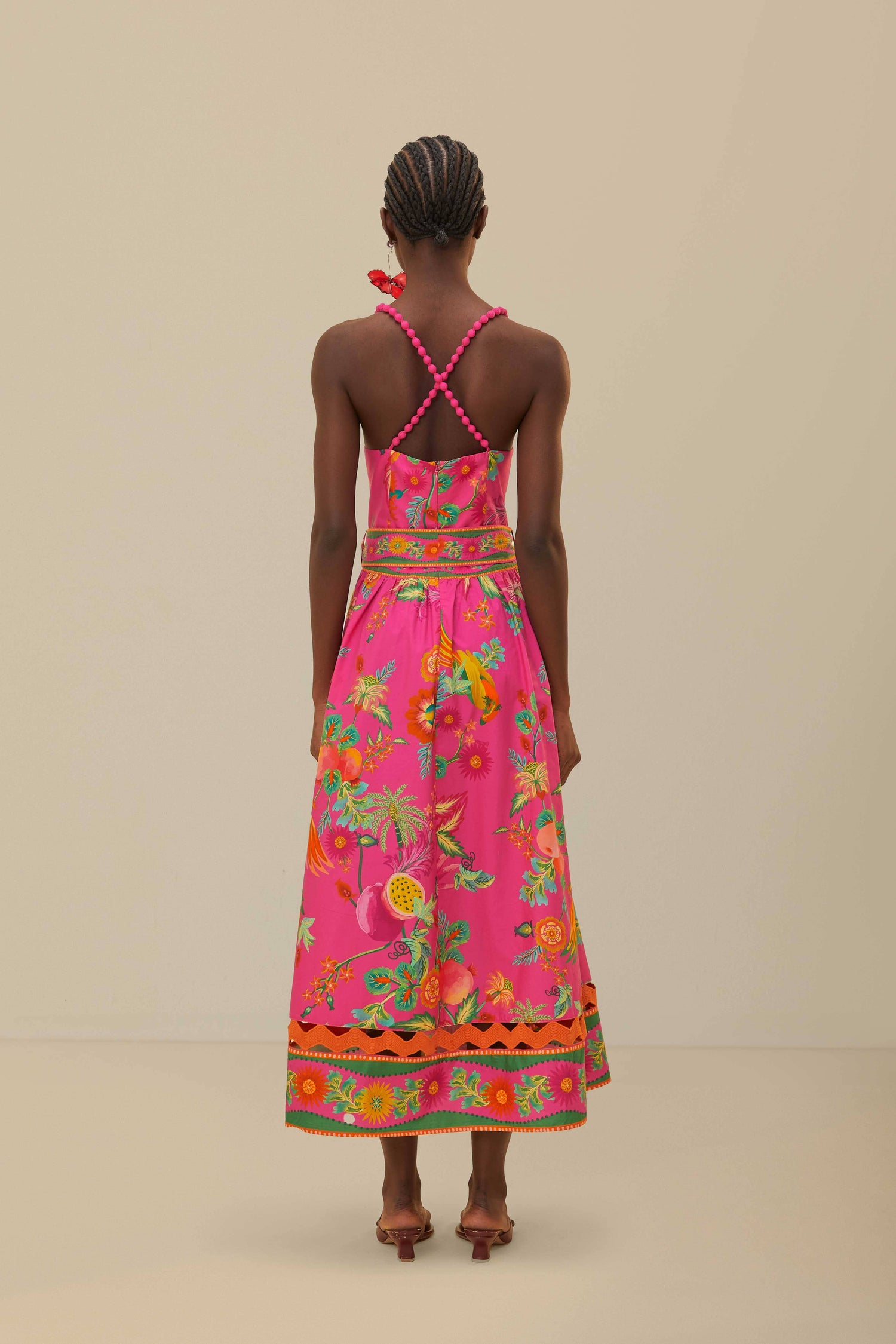 Embrace the vibrant allure of the Pink Delicate Fruit Garden Organic Cotton Midi Dress, a treasure trove of lush hues and tropical motifs. Designed with a playful sweetheart neckline and adorned with whimsical pompom straps, this piece crafts a sense of joy in every seam. Its flowing skirt, cinched with a tassel-tie waist, showcases an enchanting dance of fruits and florals, making a bold yet elegant statement. Crafted from organic cotton, this FARM Rio creation is as kind to the planet as it is to your wardrobe.