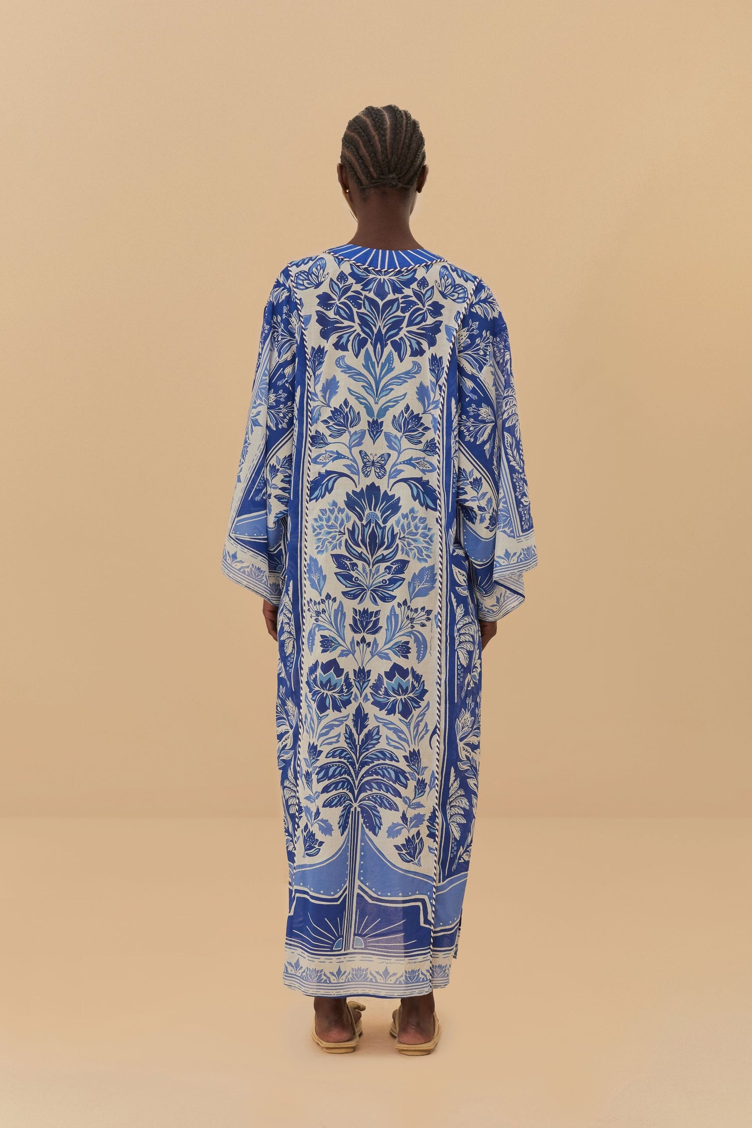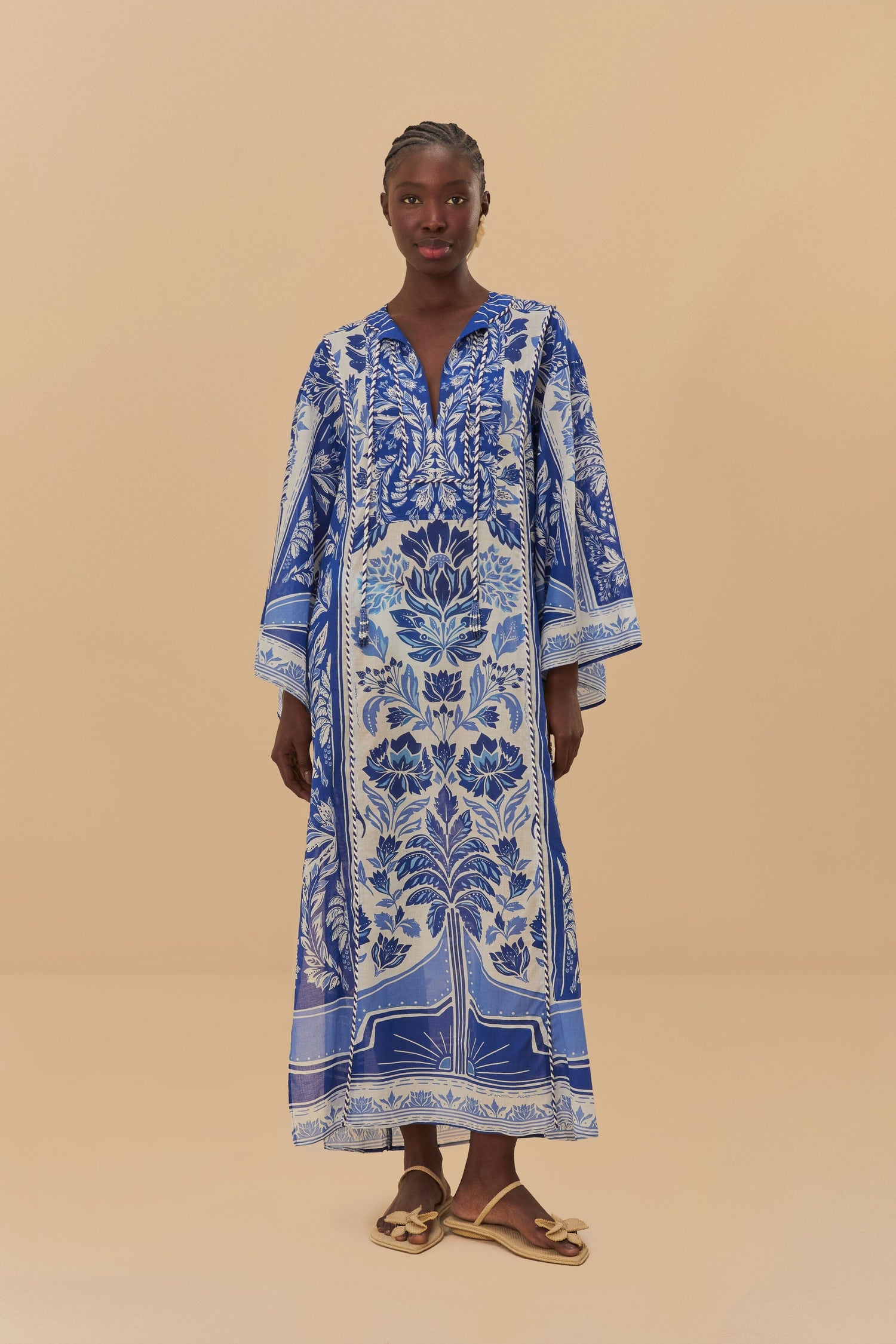 Embrace the elegance of our off-white delicate tapestry maxi cover up by FARM Rio. This piece features a mesmerizing tapestry-inspired print in soothing shades of blue and off-white. Its flowing silhouette is beautifully complemented by a round neckline. The voluminous sleeves add a playful touch, perfect for any sun-kissed adventure. Let this unique cover-up whisk you away to dreamlike shores.