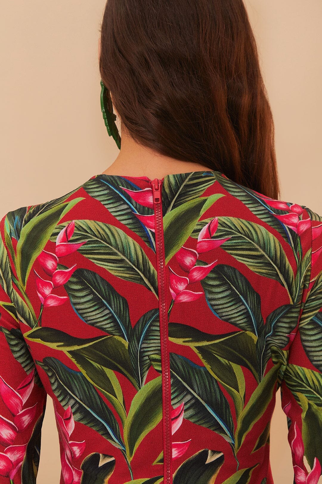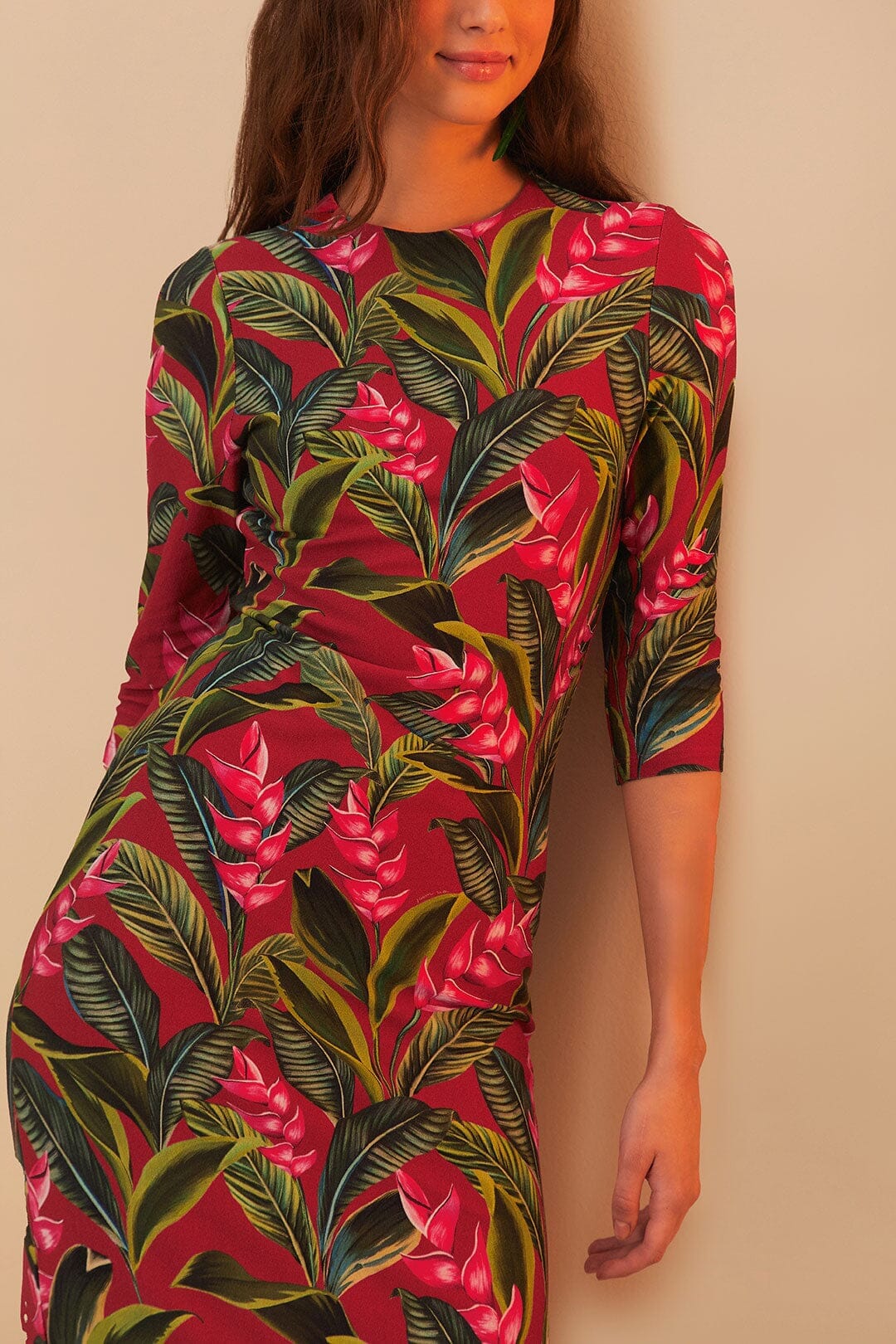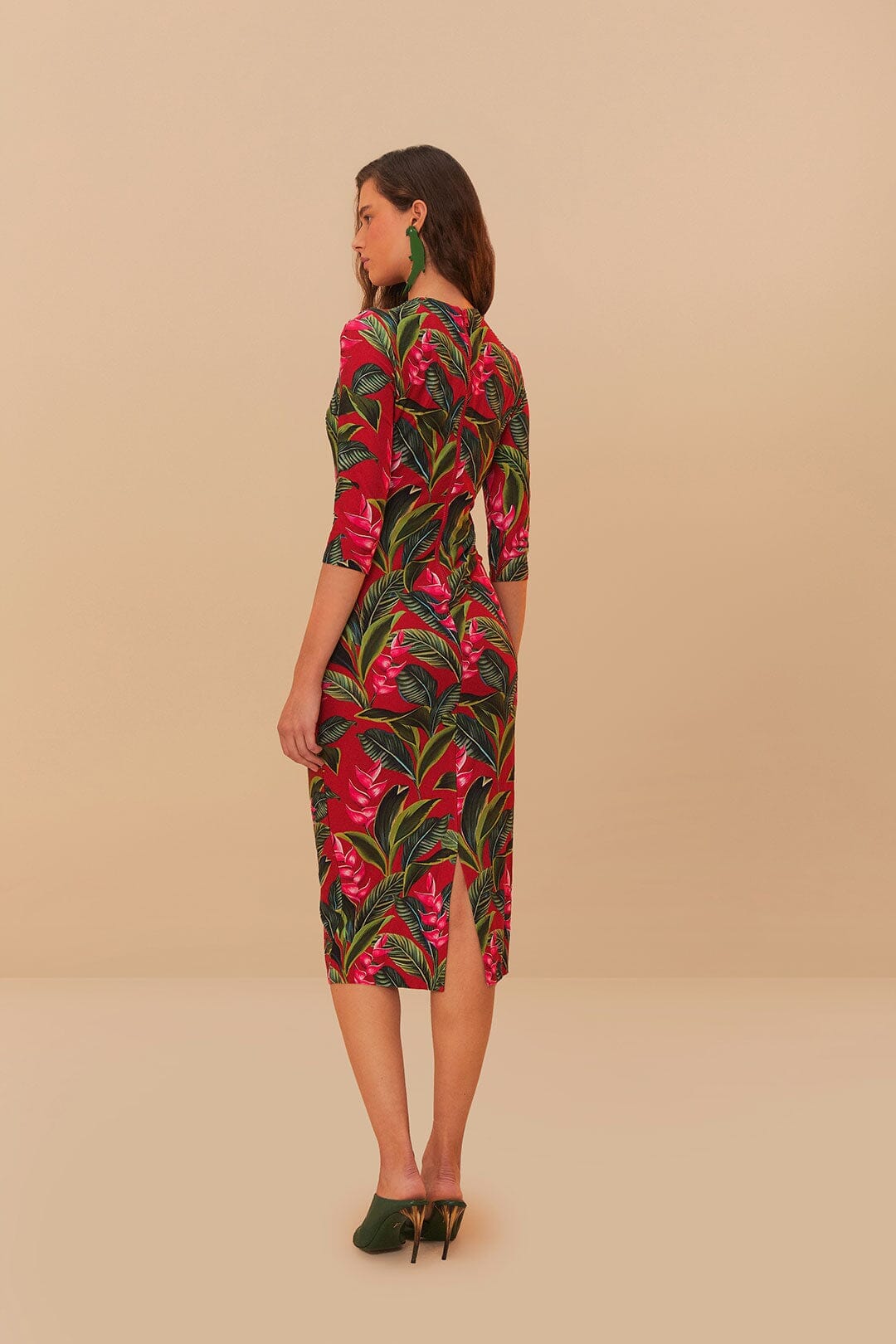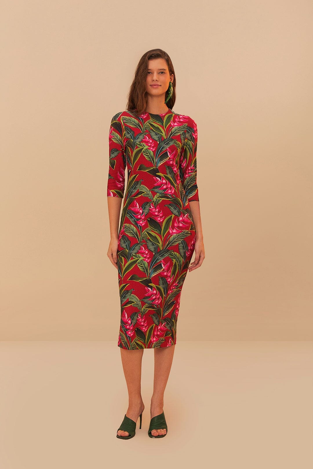 Embrace vibrant elegance with the Red Dream Garden Jersey Midi Dress by FARM Rio. Featuring a captivating tropical print of lush green leaves and vibrant pink flowers, this dress offers a playful escape into nature. The round neckline and three-quarter sleeves deliver a classic silhouette, while the soft jersey fabric flatters and flows with every step. Perfect for adding a touch of exotic flair to your everyday style.