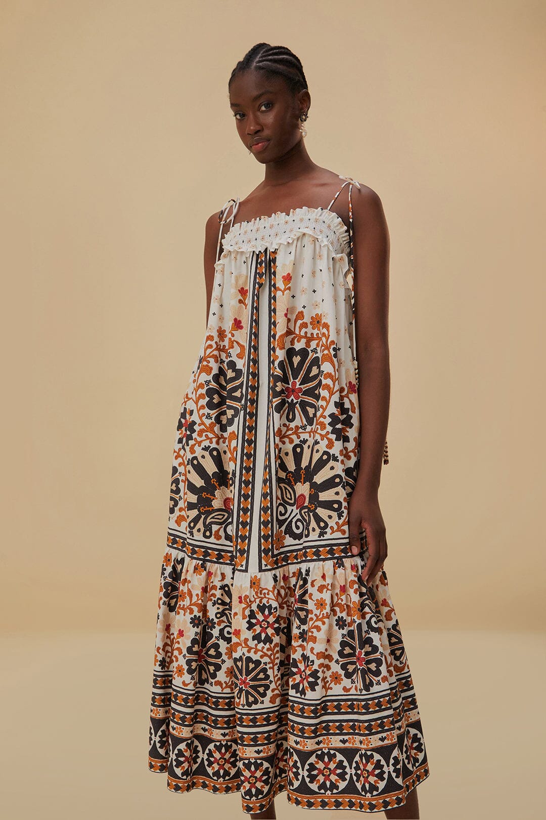Introducing our Flower Fan Tapestry Off-White Midi Dress! A playful addition to your wardrobe featuring side seam pockets, a square neckline, and a sleeveless design. Perfect for any occasion, this dress is both stylish and functional with a beautiful flower fan print.