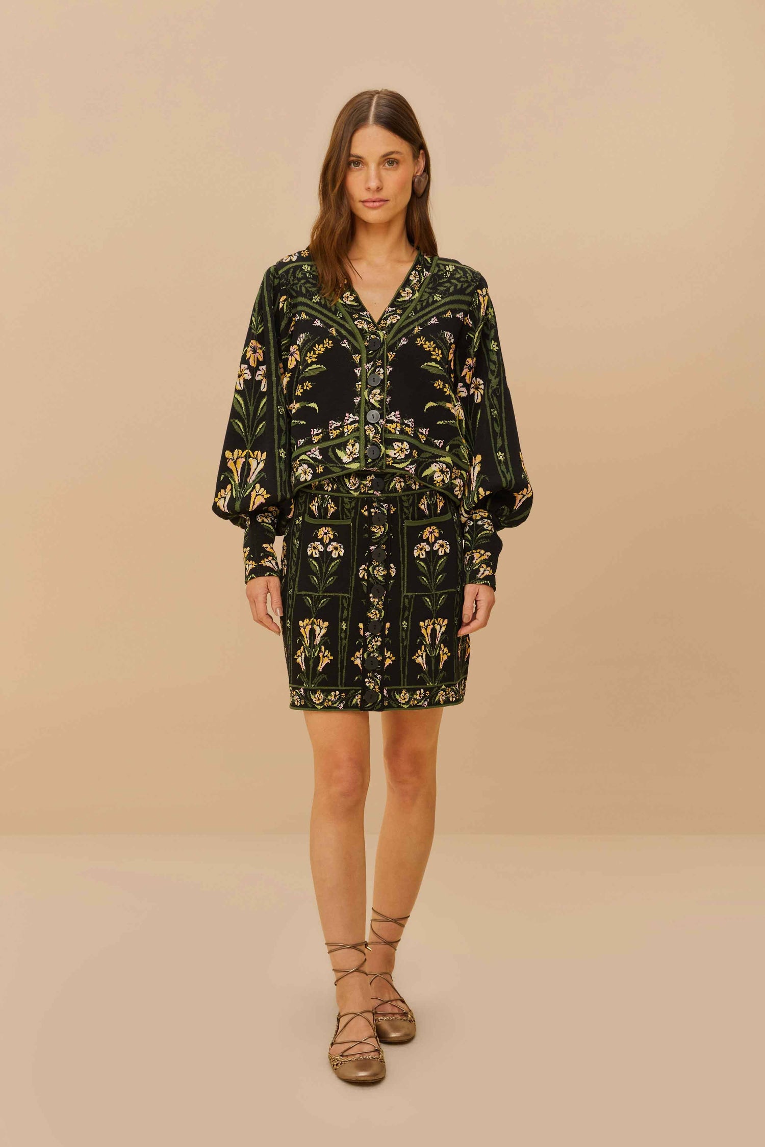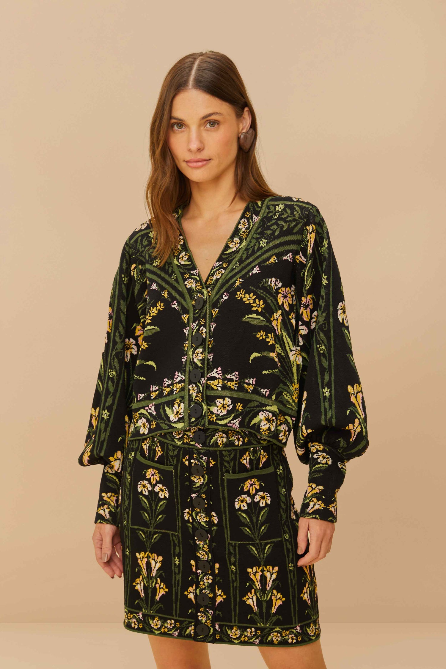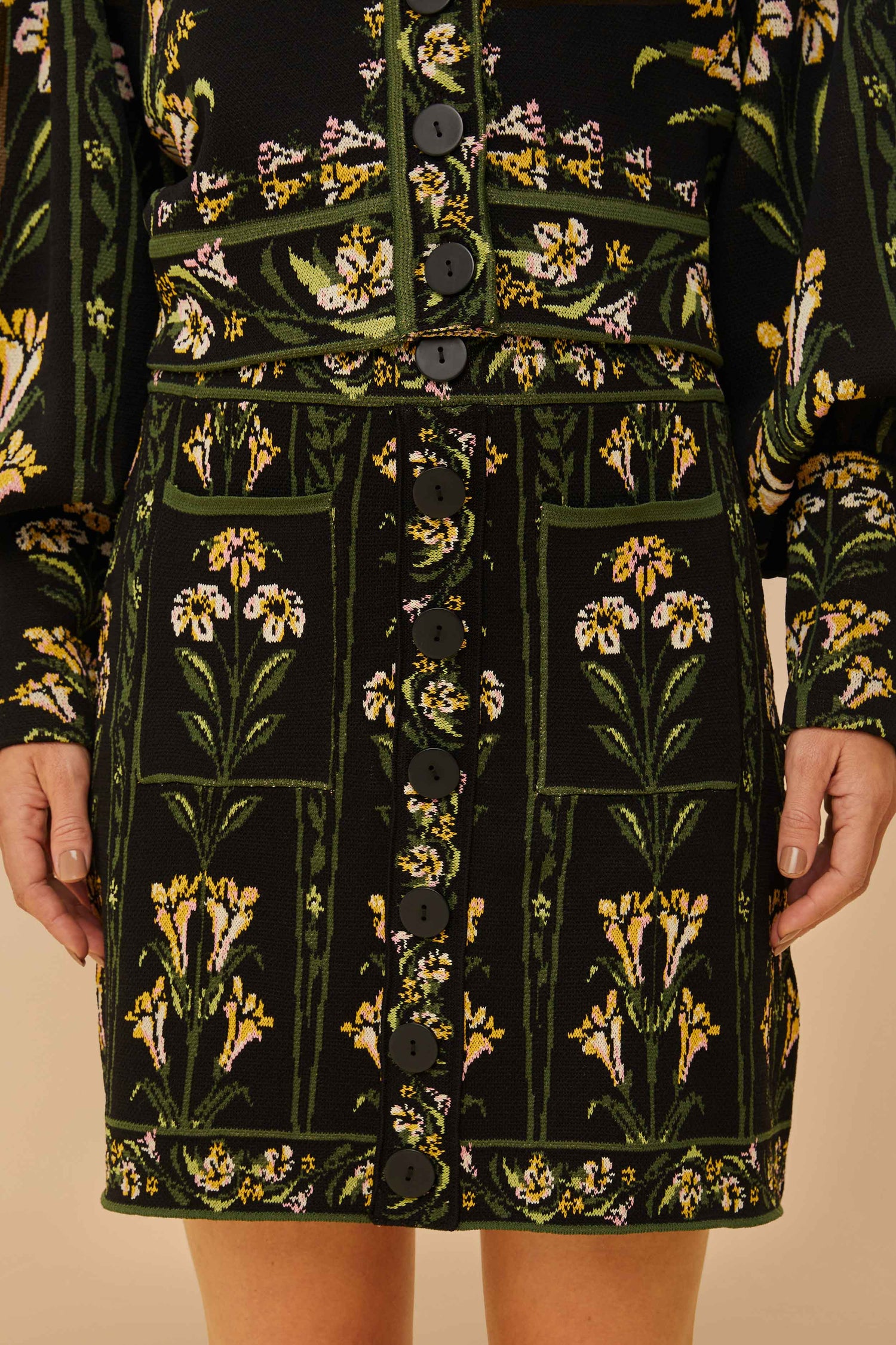 Embrace the charm of the Black Flowers Arch Knit Skirt by FARM Rio. Adorned with a tapestry of vibrant floral patterns against a deep black canvas, this skirt radiates warmth and playfulness. The tailored silhouette harmoniously blends with the delicate artistry of the floral motifs, creating a piece that's both enchanting and cozy. Perfect for those who adore a unique blend of nature-inspired elegance in their wardrobe.