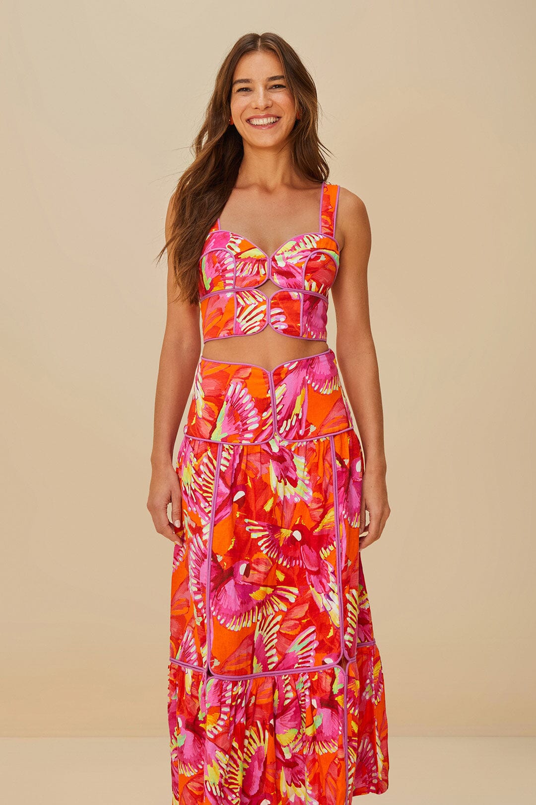 The Orange Flying Birds LENZING™ ECOVERO™ Euroflax™ Skirt by FARM Rio delights with vibrant orange hues and a playful bird motif. Crafted from responsible materials, this piece features a dynamic, flowing silhouette with captivating panels and a tiered design. The enchanting pattern brings a tropical vibe, while its impeccable cut offers effortless elegance for any occasion. Let your wardrobe take flight with this joyful and artful expression of style.