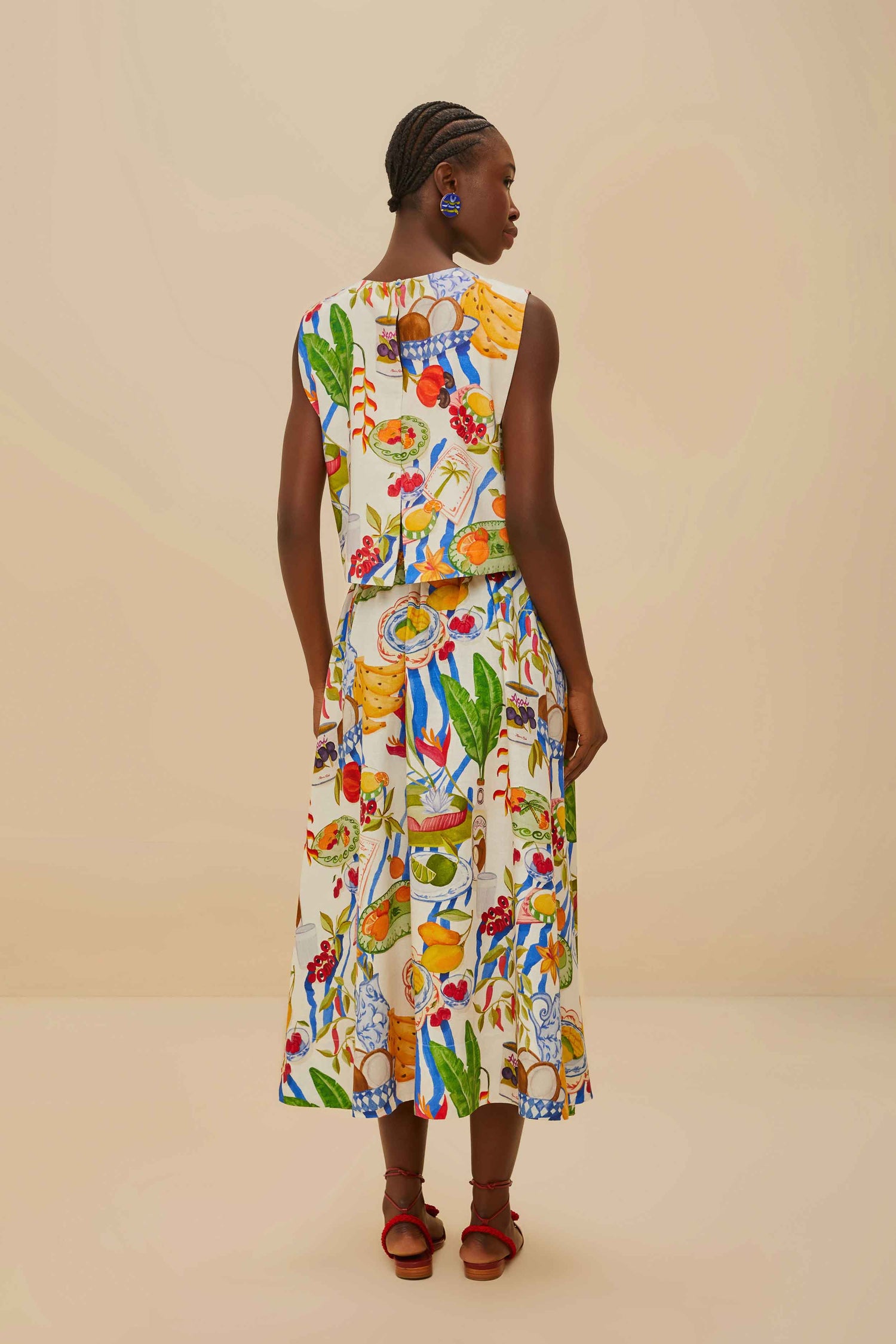 The Off-White Fresh Table LENZING™ ECOVERO™ Euroflax™ Midi Skirt by FARM Rio is a vibrant celebration of color and playful design. Featuring a delightful mix of tropical prints with fruits and plants, this skirt captures the essence of sunny days. Crafted from responsible materials, its flowy silhouette invites movement and joy, making it a charming addition to your wardrobe. A touch of Brazilian summer for any occasion.