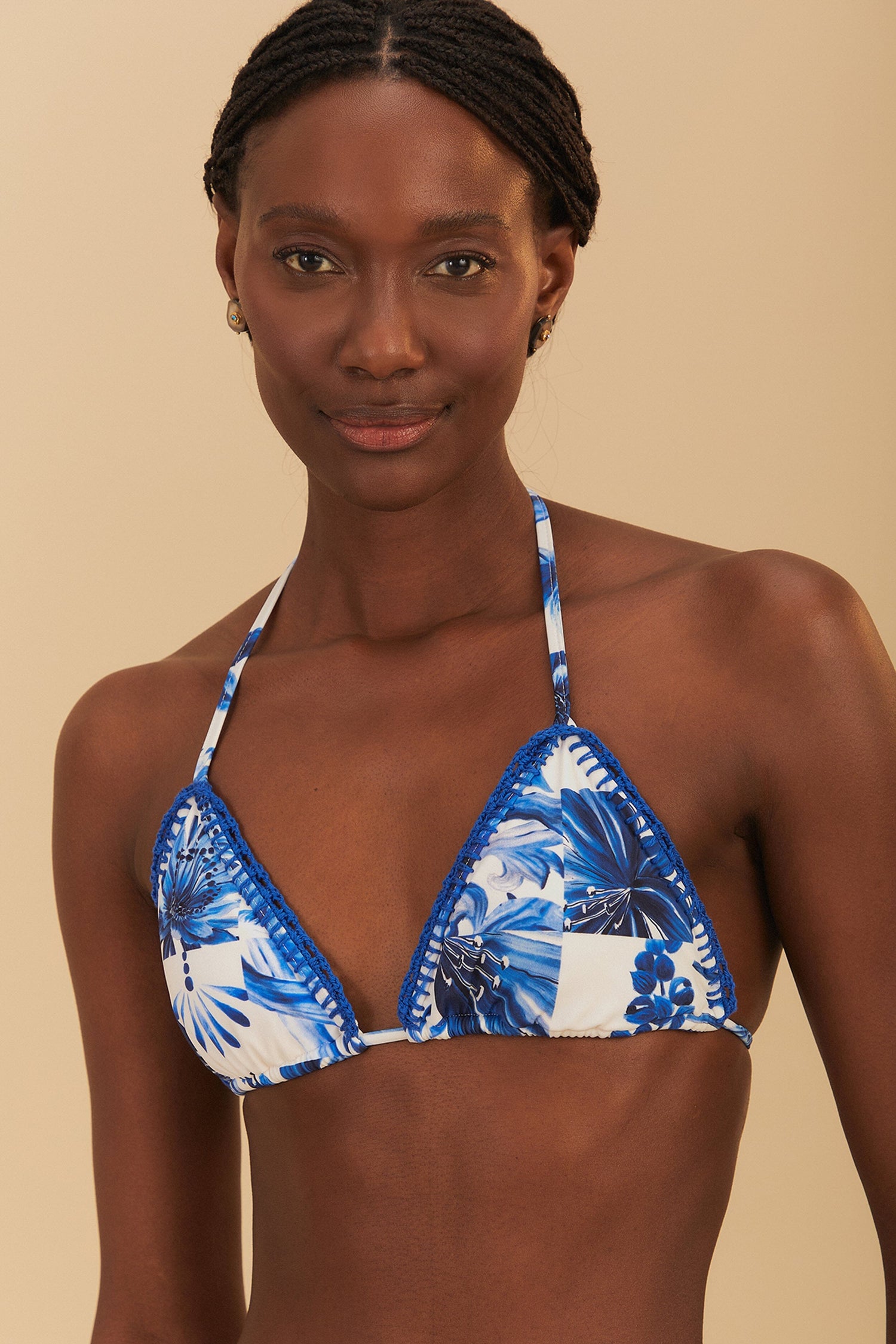 Embrace vibrant elegance with the Off-White Garden Tiles Triangle Bikini Top from FARM Rio. Featuring a playful V neckline, this bikini top is adorned with stunning blue botanical patterns that pop against the soft off-white background. Delicate ties ensure a perfect fit, while the intricate design captures a sunny, carefree essence. Perfect for adding a splash of joy to your beach days.