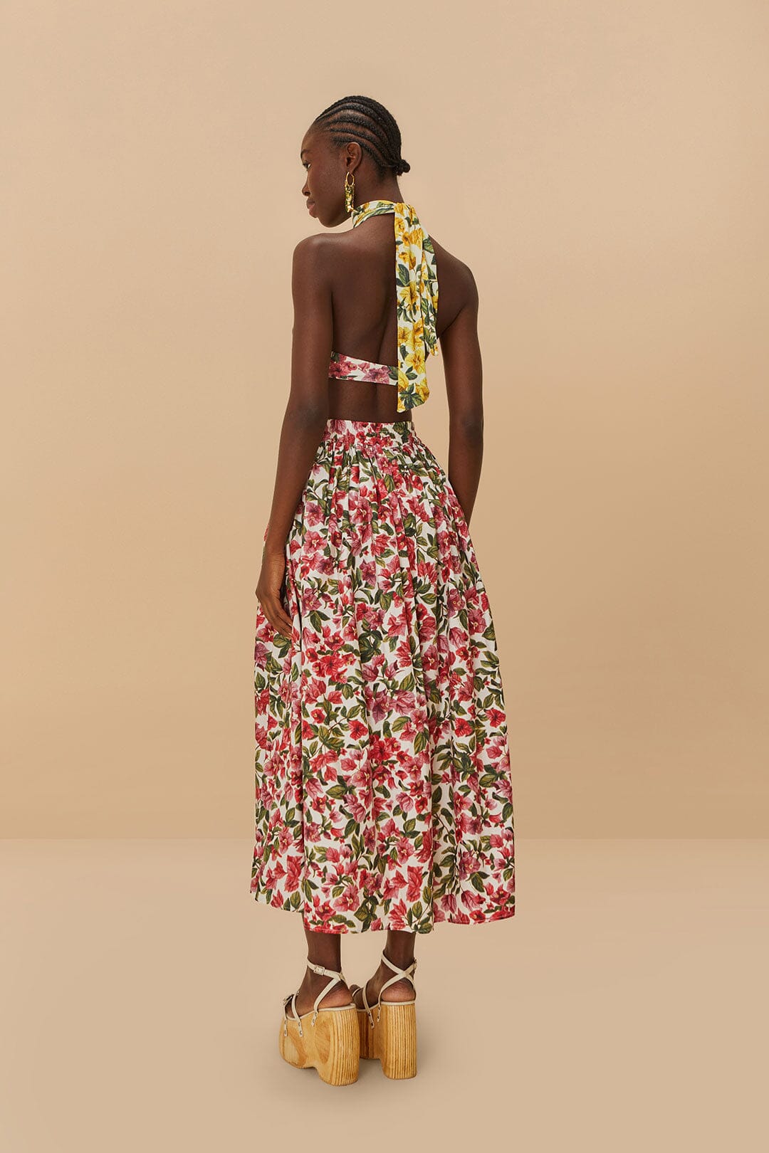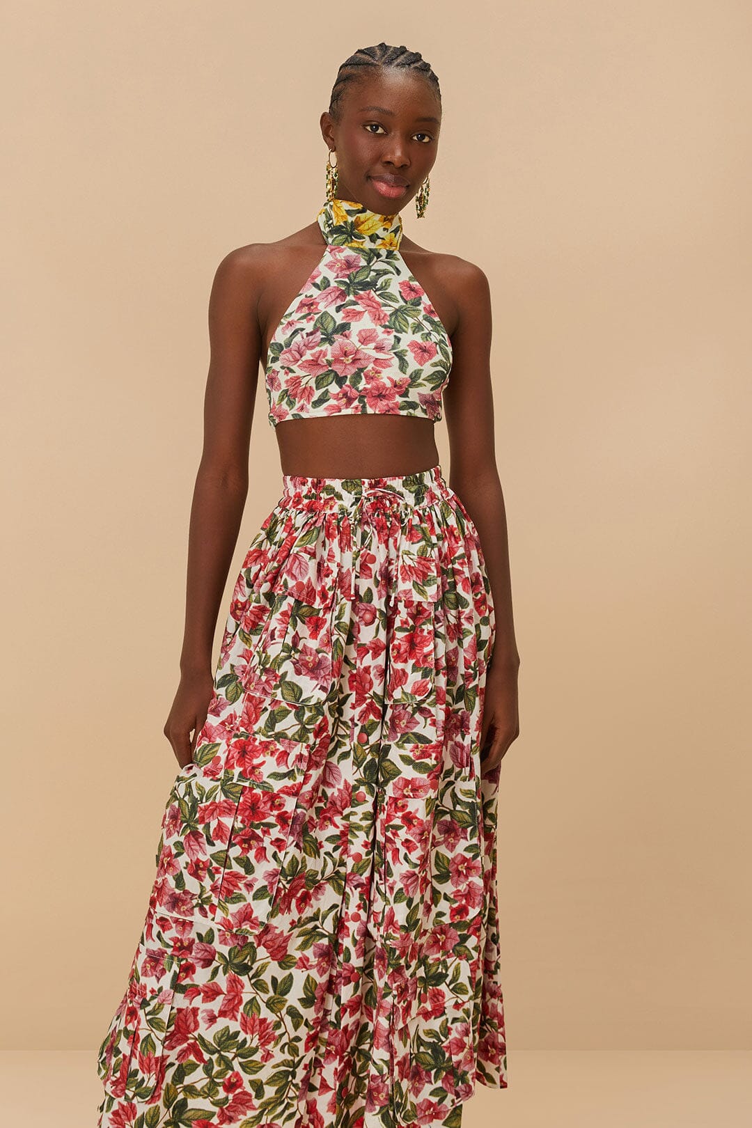 Step into a world of vibrant elegance with the Pink Halftone Bougainvillea Organic Cotton Maxi Skirt. This delightful piece showcases a mesmerizing floral pattern in lush shades of pink and green, exuding a lively charm. The flowing silhouette offers comfort and movement, perfect for sunlit strolls. Crafted from responsible materials, this maxi skirt invites you to embrace a playful style with a conscious heart.