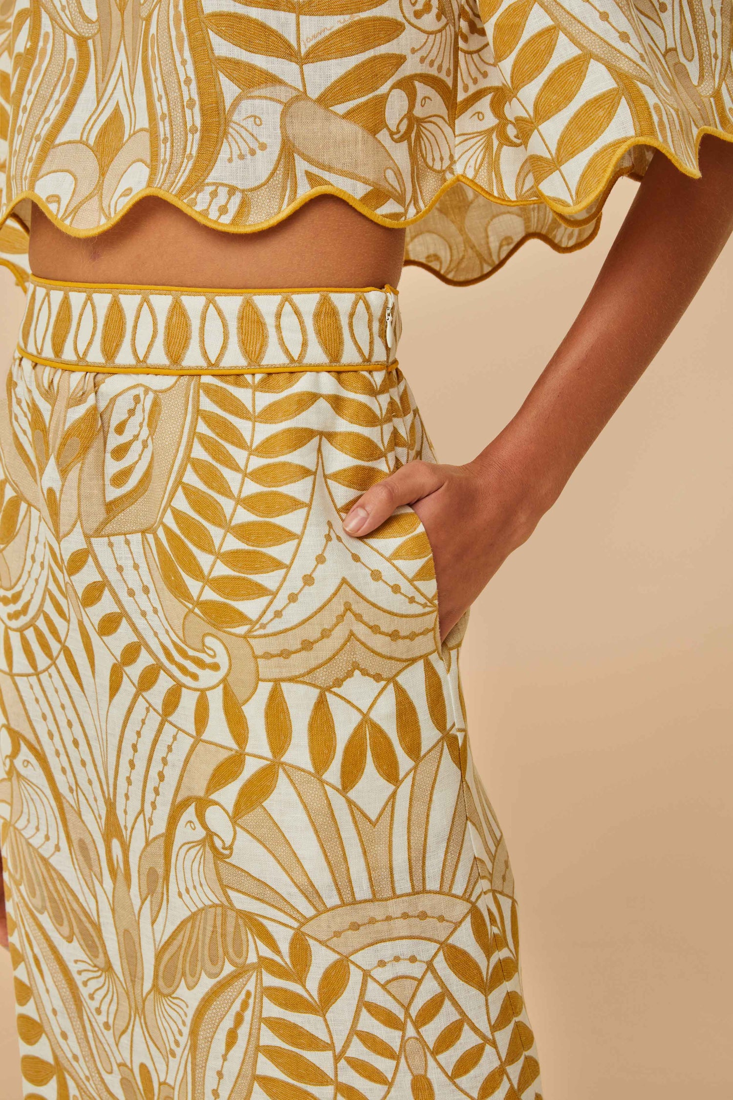 Embrace the charm of the off-white lace nature euroflax™ premium linen midi skirt. Crafted from responsible materials, this exquisite piece features a delightful nature-inspired pattern in warm ochre tones. Its flowing silhouette and intricate lace detailing evoke a sense of whimsy and elegance. Perfect for any occasion, this skirt adds a playful touch to your wardrobe while offering a soft and comfortable fit.