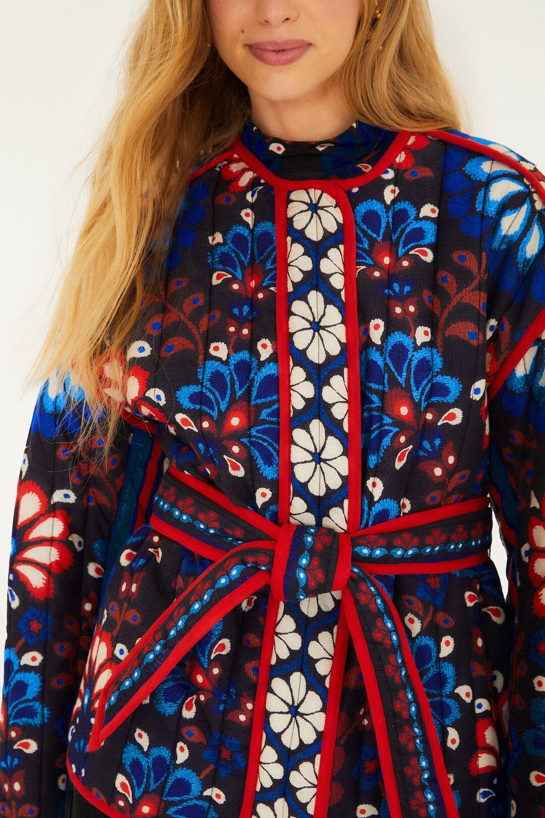 Embrace effortless charm with the Black Latina Scarf Belted Crop Jacket by FARM Rio. This outerwear piece features a high neckline that frames the face with graceful sophistication, while the cropped silhouette highlights the waist with a playful scarf belt tie. Crafted in a rich black hue, it combines sleek structure with softness, inviting layering and movement. Perfect for adding a touch of bold, confident warmth to your wardrobe.