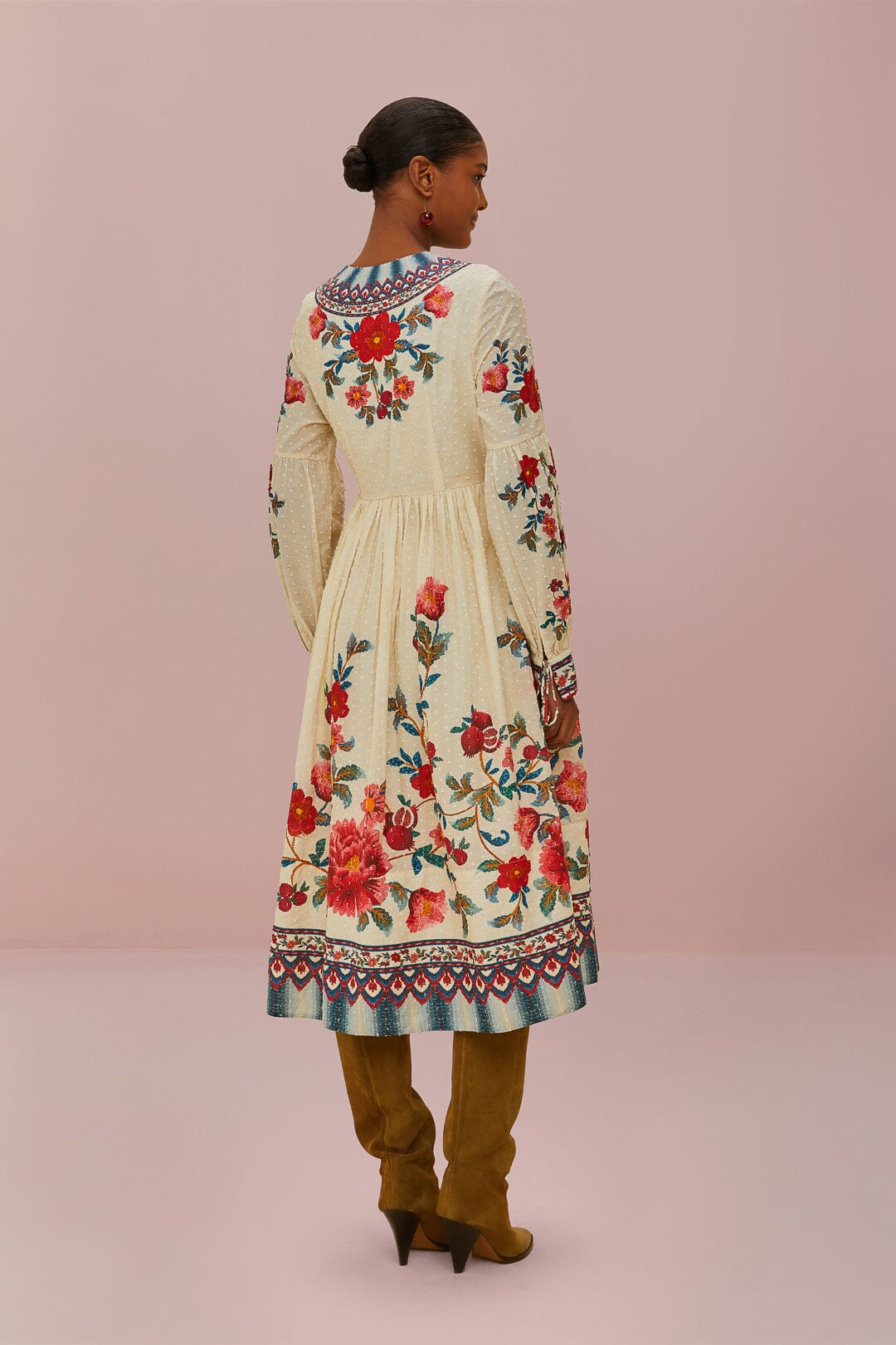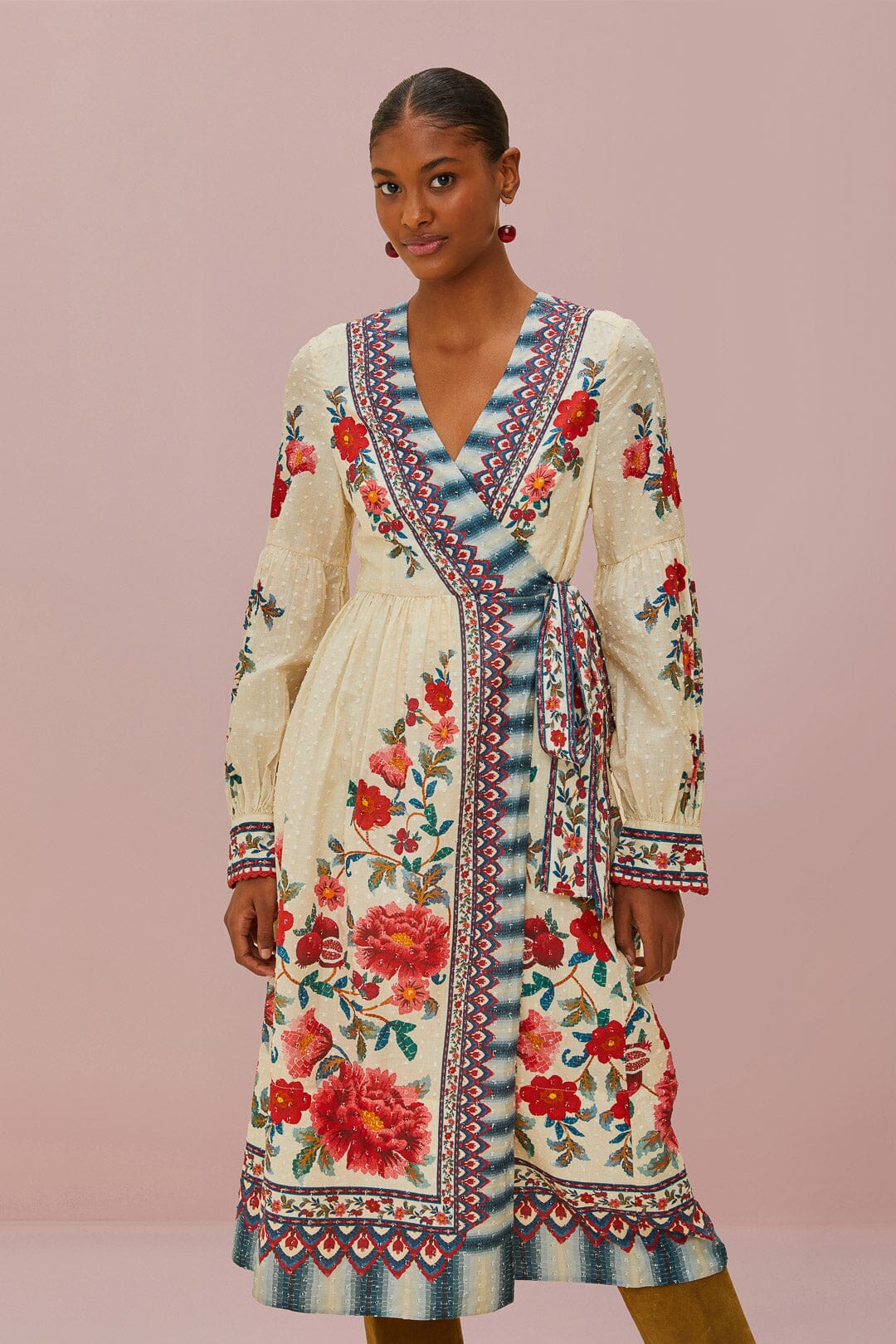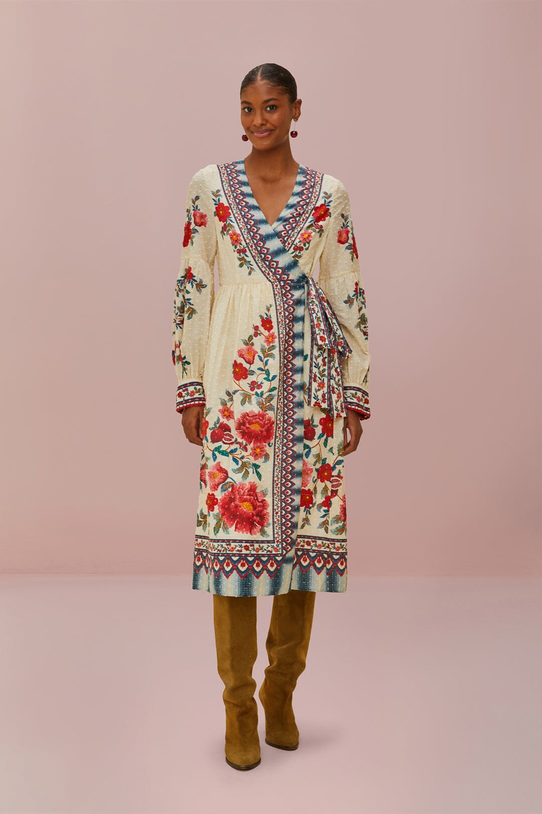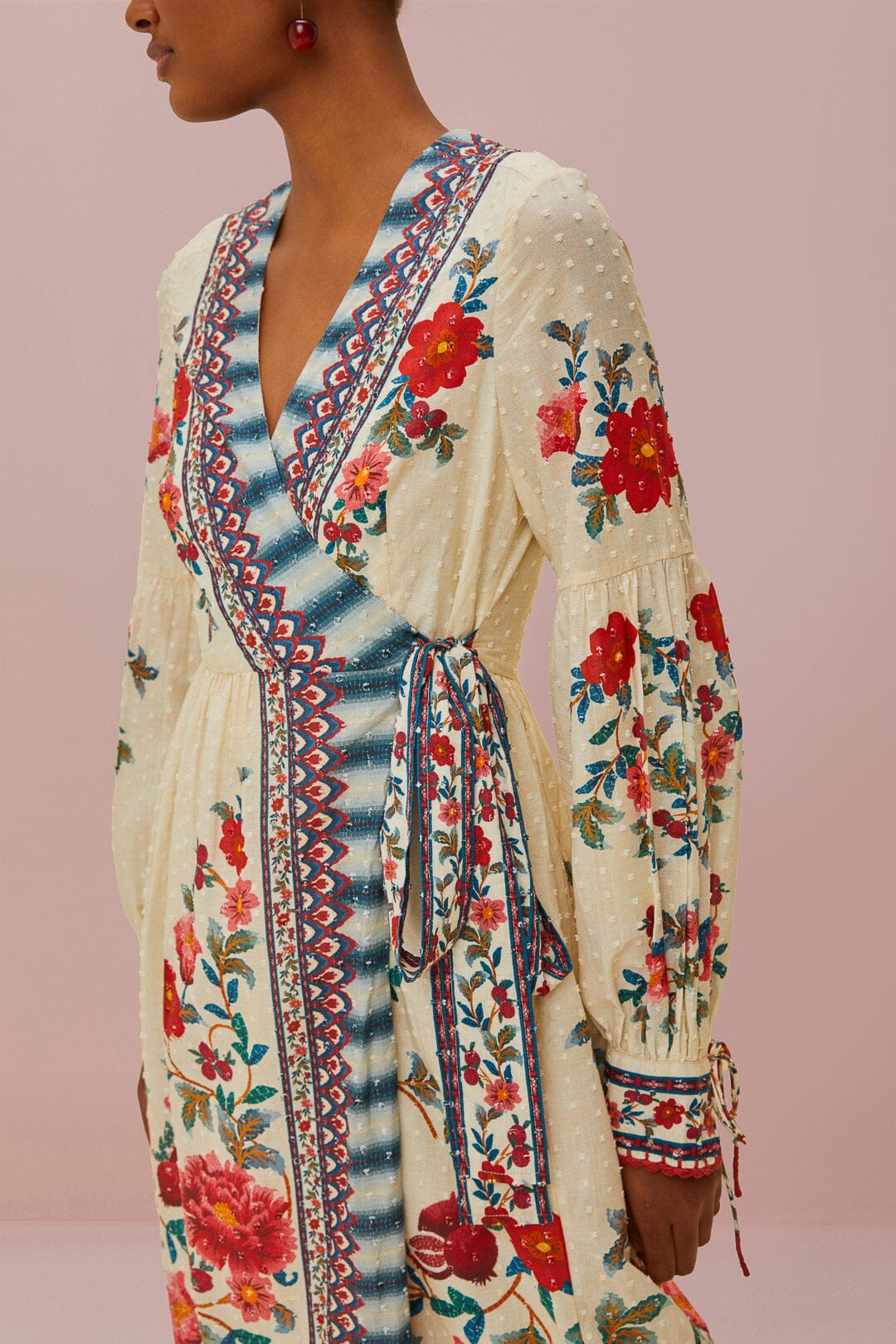 Step into elegance with the Sand Mosaic Garden Wrap Midi Dress from FARM Rio. This enchanting piece features a playful V neckline and a wrap silhouette that gracefully embraces the figure. The vibrant floral embroidery blooms across a soft background, while voluminous sleeves add a touch of drama. A beautiful mix of colors and patterns creates a garden of visual delight, making every moment feel special.