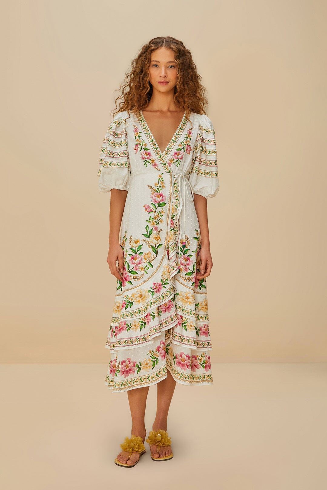 Embrace effortless elegance with the Off-White Palm Dream Wrap Midi Dress from FARM Rio. This enchanting piece features a flattering V neckline and playful puffed sleeves. The soft off-white fabric is adorned with vibrant floral patterns that evoke a tropical paradise. A charming wrap silhouette, combined with delicate ruffles, adds a whimsical touch, making it a perfect choice for those dreamy, sunlit days.