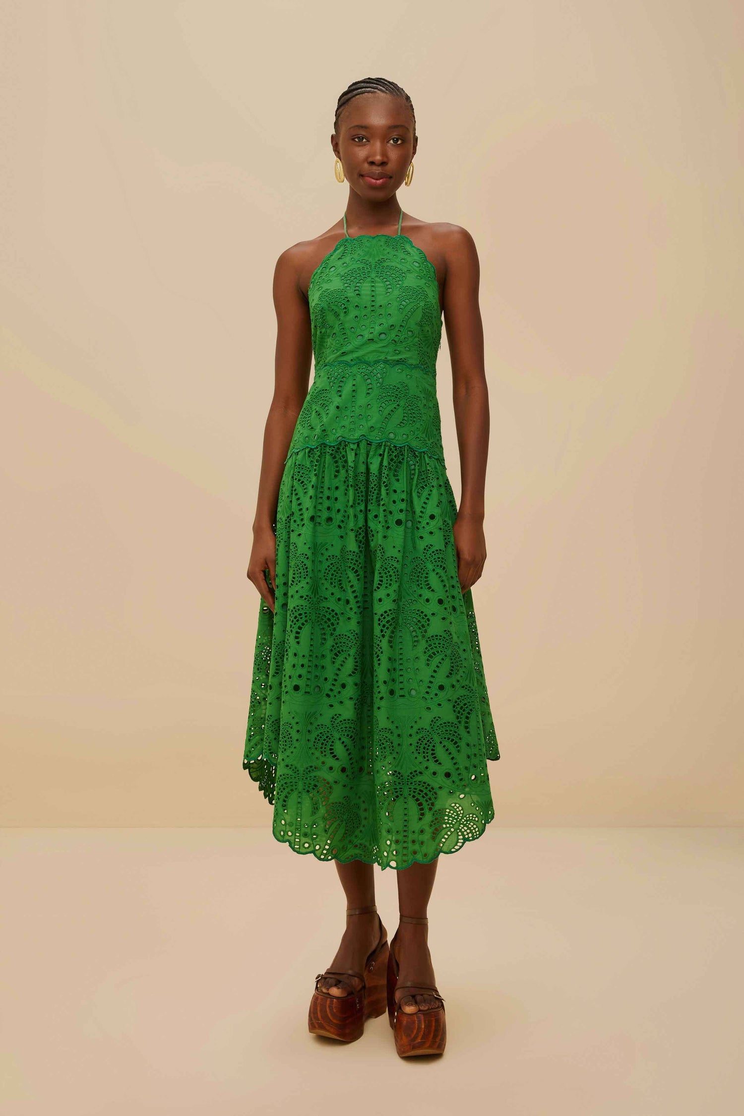 Discover effortless elegance with the green palm tree eyelet halter neck midi dress from FARM Rio. This stunning piece boasts a charming halter neckline that gracefully frames the shoulders, while intricate eyelet detailing weaves through lush palm patterns in vibrant green. The flowing midi length invites a sense of playfulness, perfect for sunlit strolls or moonlit evenings, exuding a tropical allure that's both captivating and refreshing.