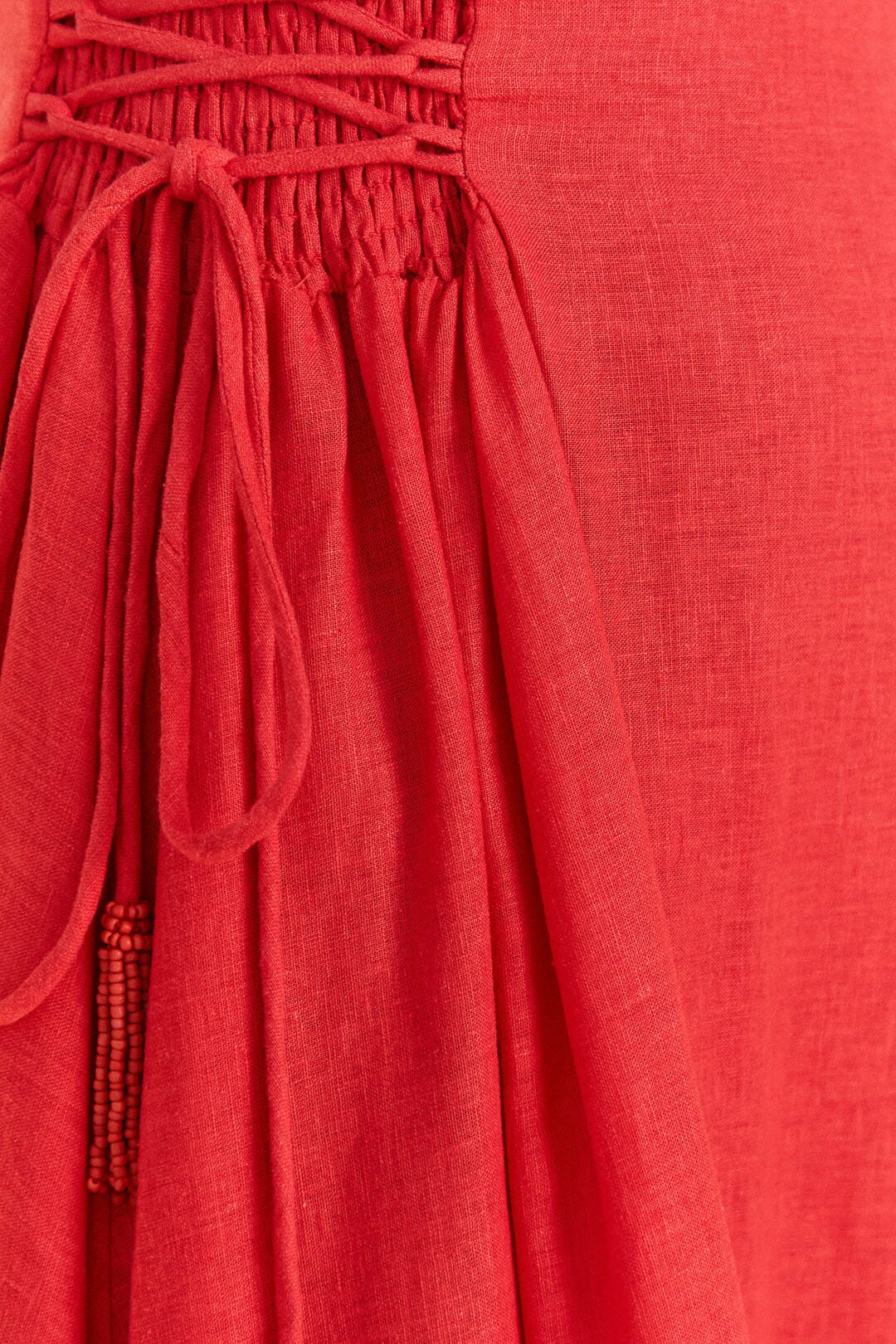 Cheers to more sunlight hours to be in the far-from-ordinary Red Sleeveless Midi Dress! It features an easy-breezy silhouette with cross-tie detailing and beaded tassels in the smocked bodice, and a flowy skirt that goes with your solar flow all season long. Your fresh shoes and artisanal accessories are invited to complete the Summer look, and you’ll be ready to express your bold self in every place :)