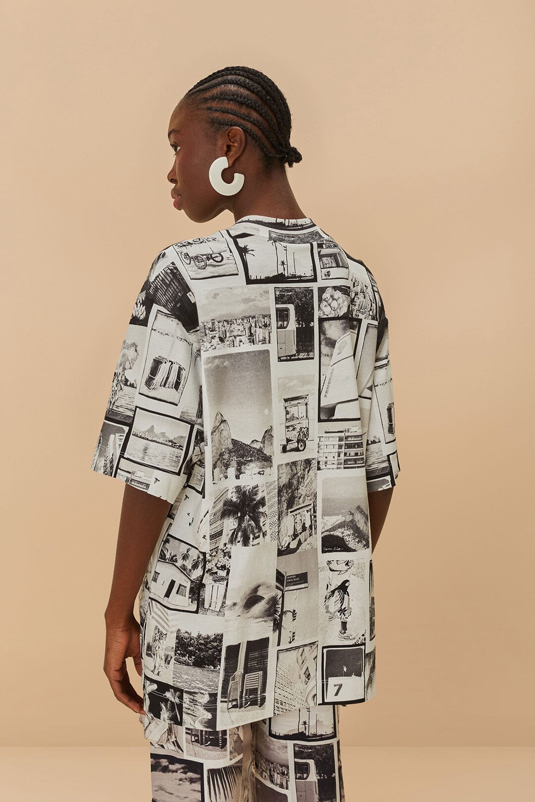 Embrace the vibrant spirit of the Multicolor Rio Noir T-Shirt by FARM Rio. This piece captivates with its unique photo collage pattern that tells a story of adventure. The round neckline and relaxed silhouette offer both comfort and style, while the playful blend of monochrome imagery seamlessly pairs with any look. Let this artistic creation transport you to the heart of Rio, wherever you go.