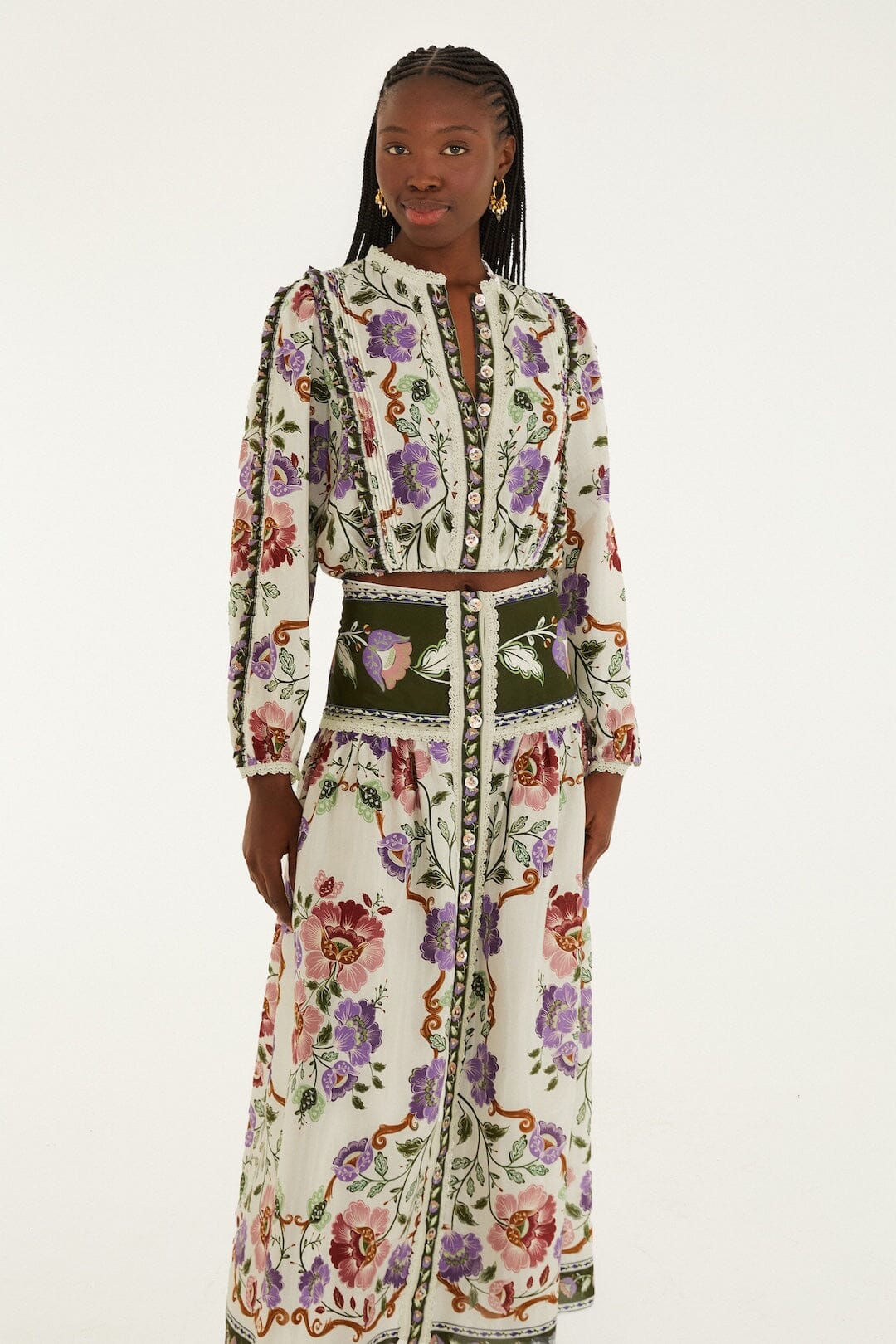Embrace effortless charm with the Cream Rococo Flowers Lace Buttoned Midi Skirt from FARM Rio. Delicately crafted in soft cream lace, this skirt features an enchanting Rococo floral pattern that dances across the fabric. Its flattering midi silhouette gently skims the hips before flowing into a playful, buttoned front, adding a touch of vintage romance. Light, breezy, and full of texture, it’s a beautifully unique piece that invites warmth and joy into every step.