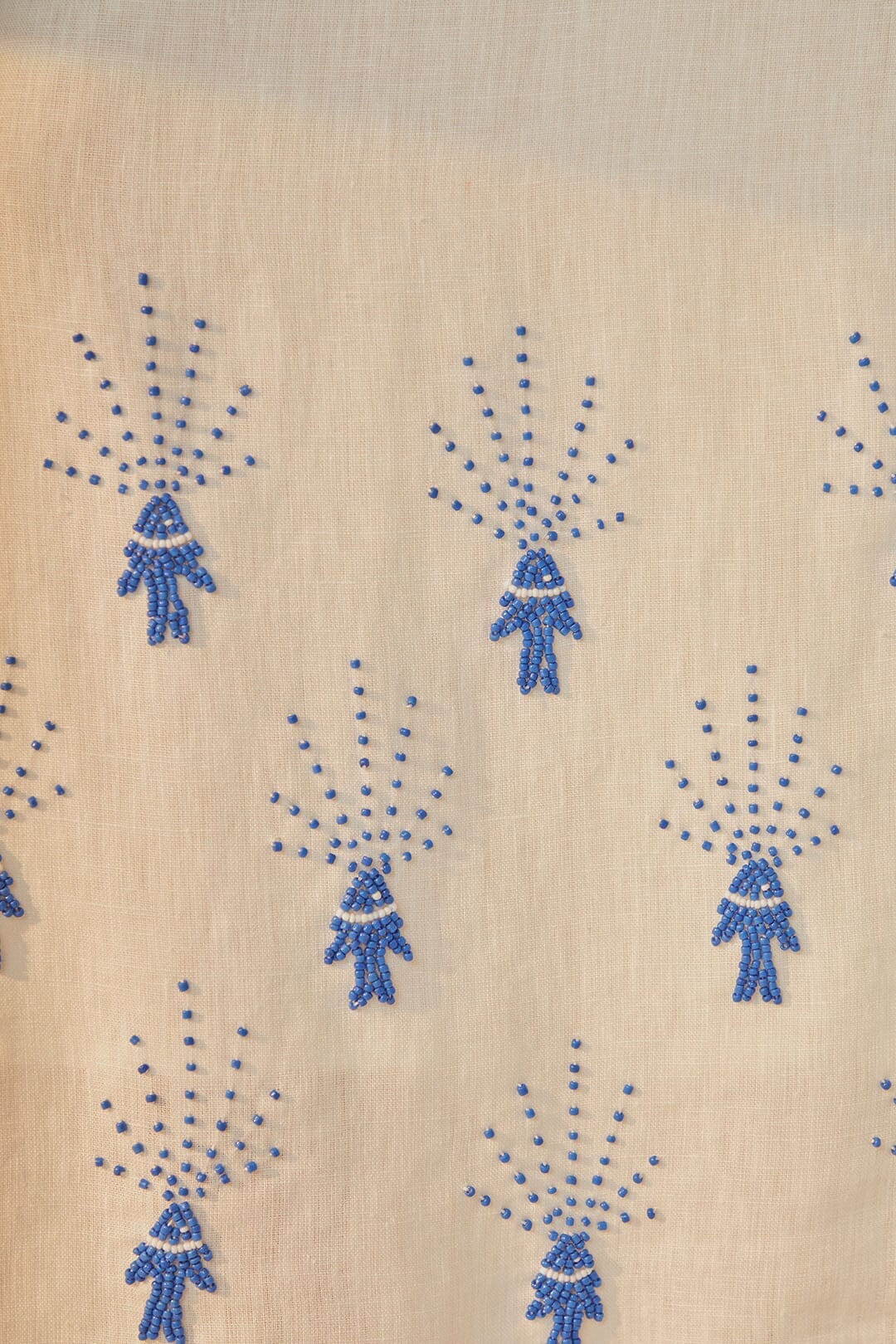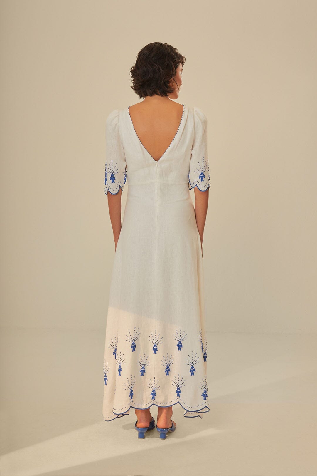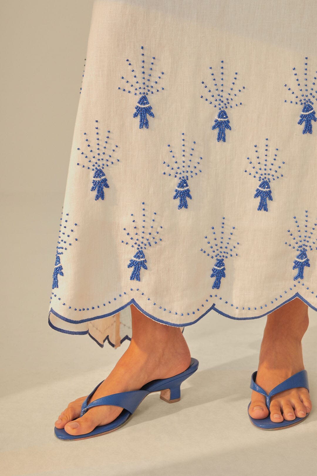 Drift into the essence of coastal charm with the Off-White Sea Of Fish Embroidered Midi Dress. Meticulously crafted with delicate embroidery, this piece features an enchanting sea of fish motif in tranquil blue hues, dancing along the hemline and sleeves. The unique cut-outs and scalloped edges gracefully echo the fluidity of the ocean. Nestled in soft, responsibly sourced fabrics, its airy silhouette offers an inviting embrace, making every moment an invitation to unwind in breezy elegance.