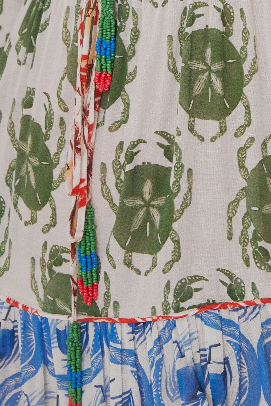 Embrace the unique charm of Brazil with the Stamp Mix Long Sleeve Maxi Dress by FARM Rio. This exquisite piece features a round neckline complemented by an enchanting display of tiered patterns, creating a fluid symphony of colors. Each layer tells its own story, starting with lush green and tranquil blue, cascading down to a vibrant coral red, all accentuated with playful turtle motifs. Subtle beadwork adds a touch of whimsy, making this dress a true reflection of joyful artistry and effortless style.