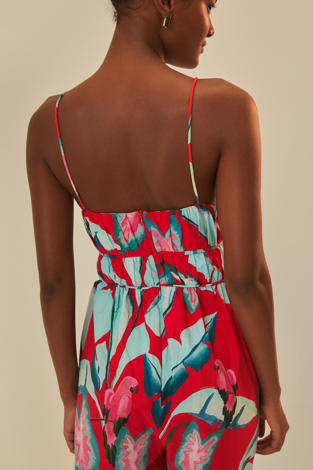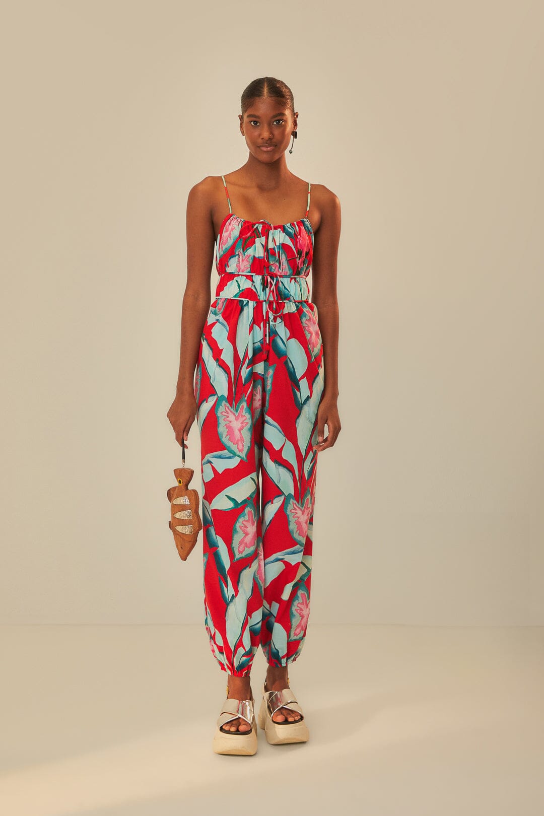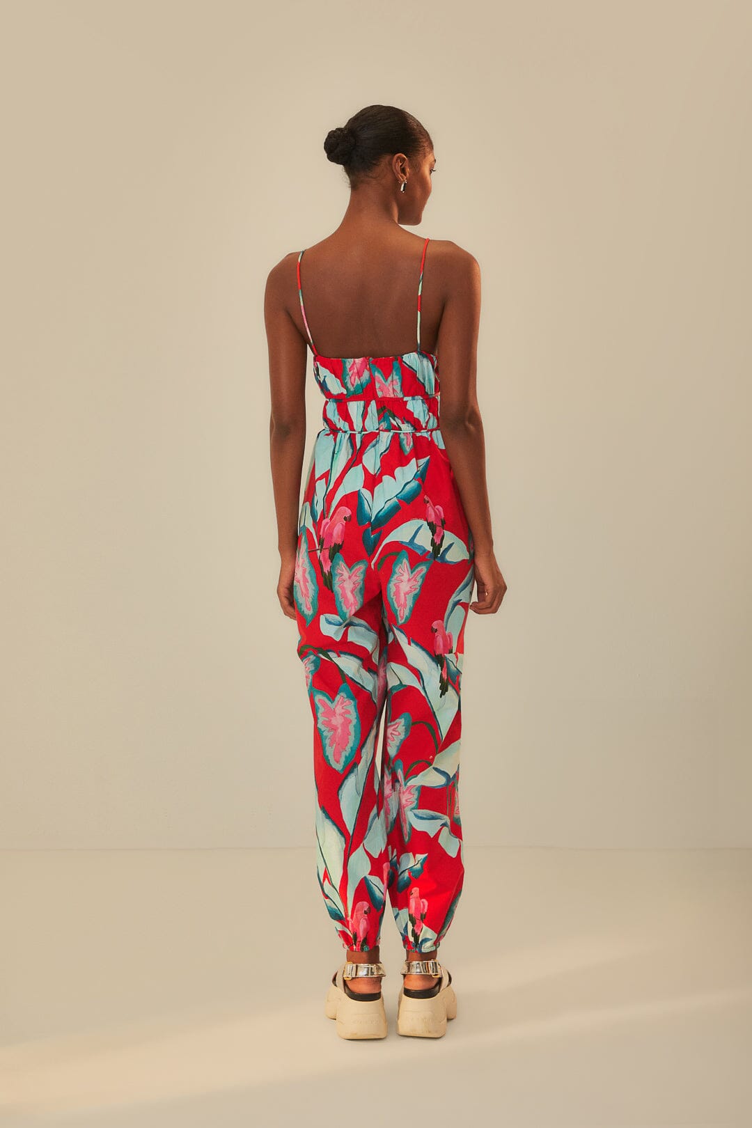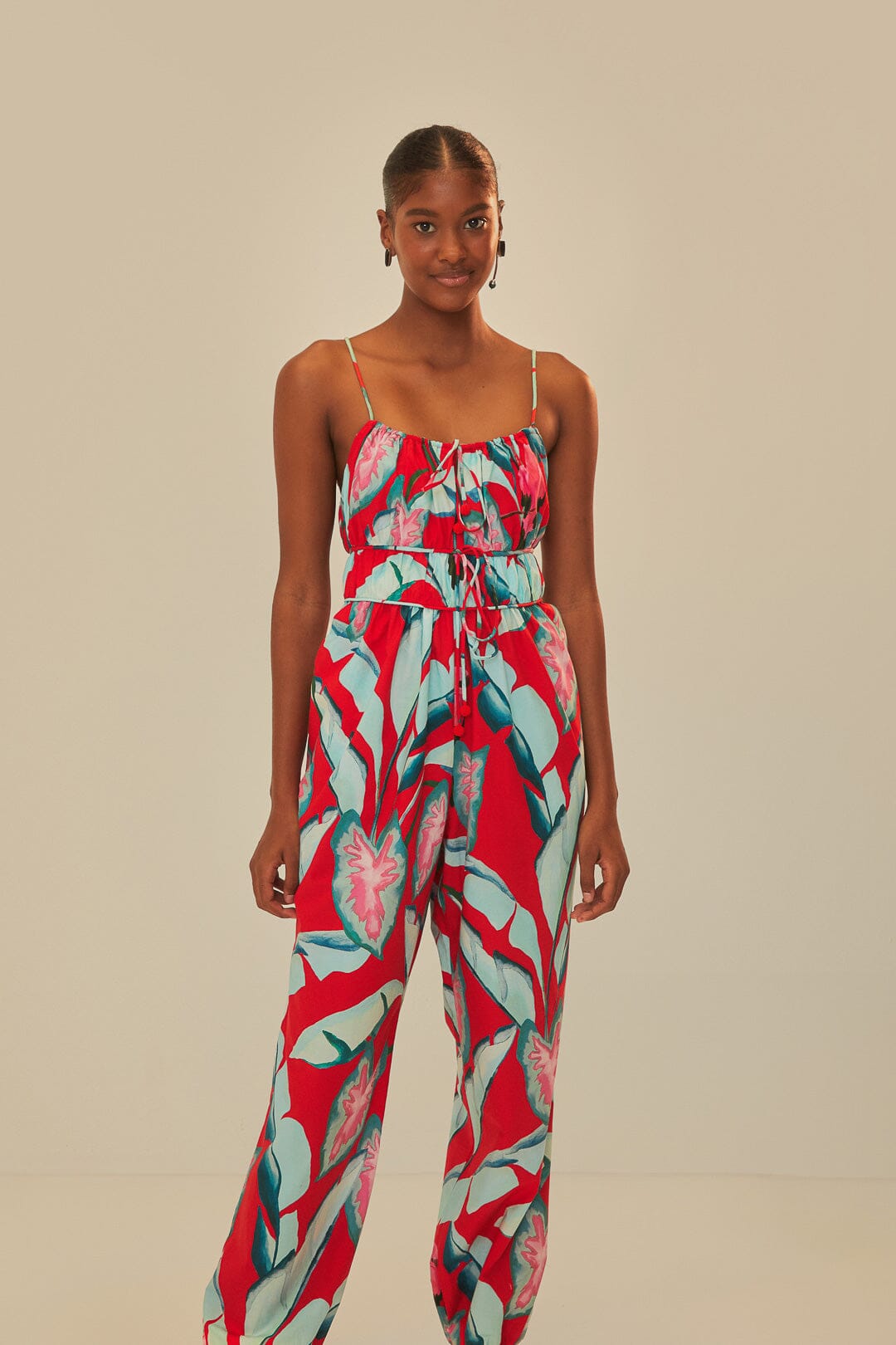 Embrace the energy of nature with the Red Summer Foliage Organic Cotton Jumpsuit by FARM Rio. This eye-catching piece features a vibrant red backdrop adorned with lush, tropical foliage in striking blues and pinks. A flattering square neckline and delicate shoulder straps frame the silhouette, while the drawstring waist allows for a bespoke fit. Crafted from organic cotton, this jumpsuit offers both comfort and a tender touch to the environment. Step into a tropical paradise with every wear.