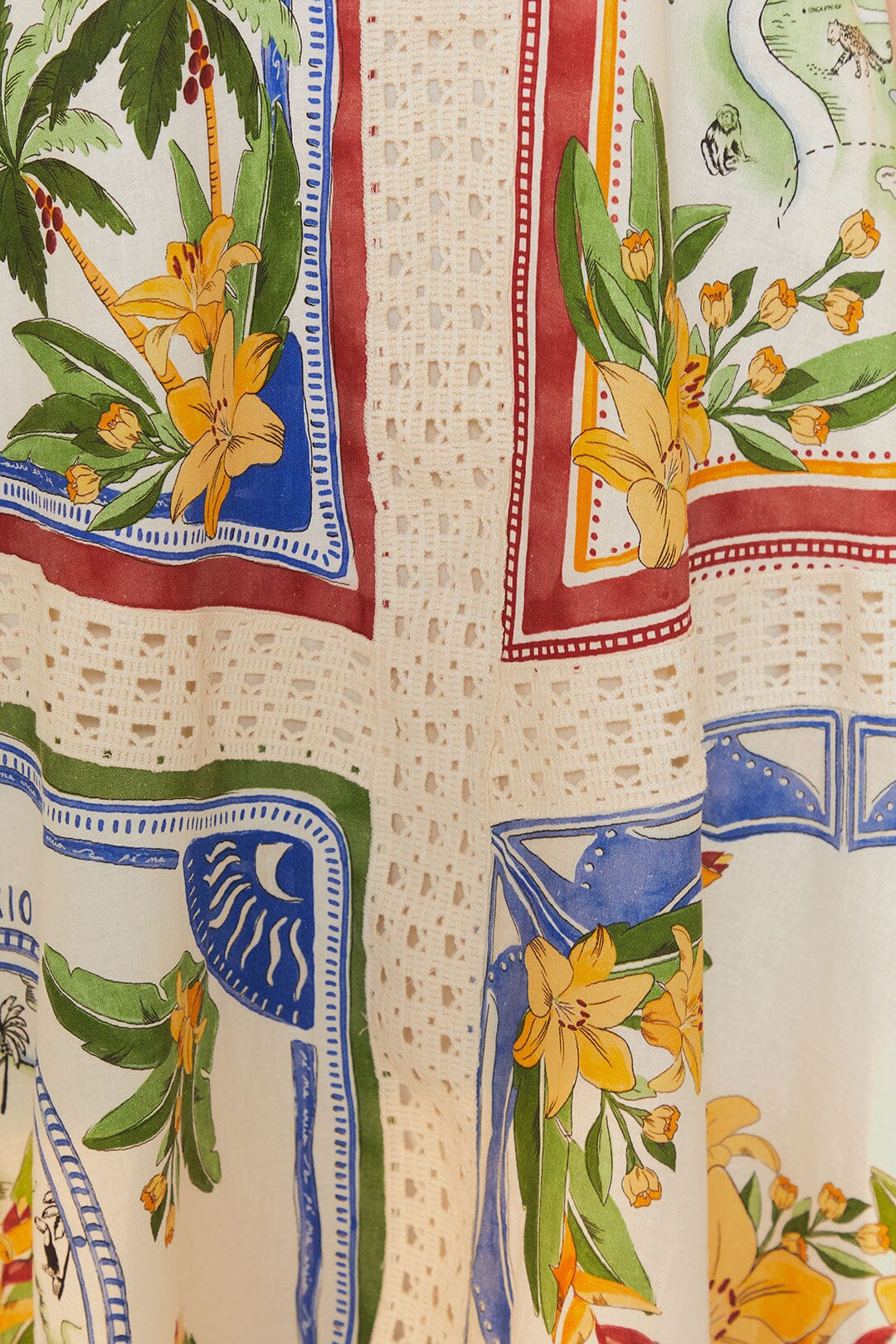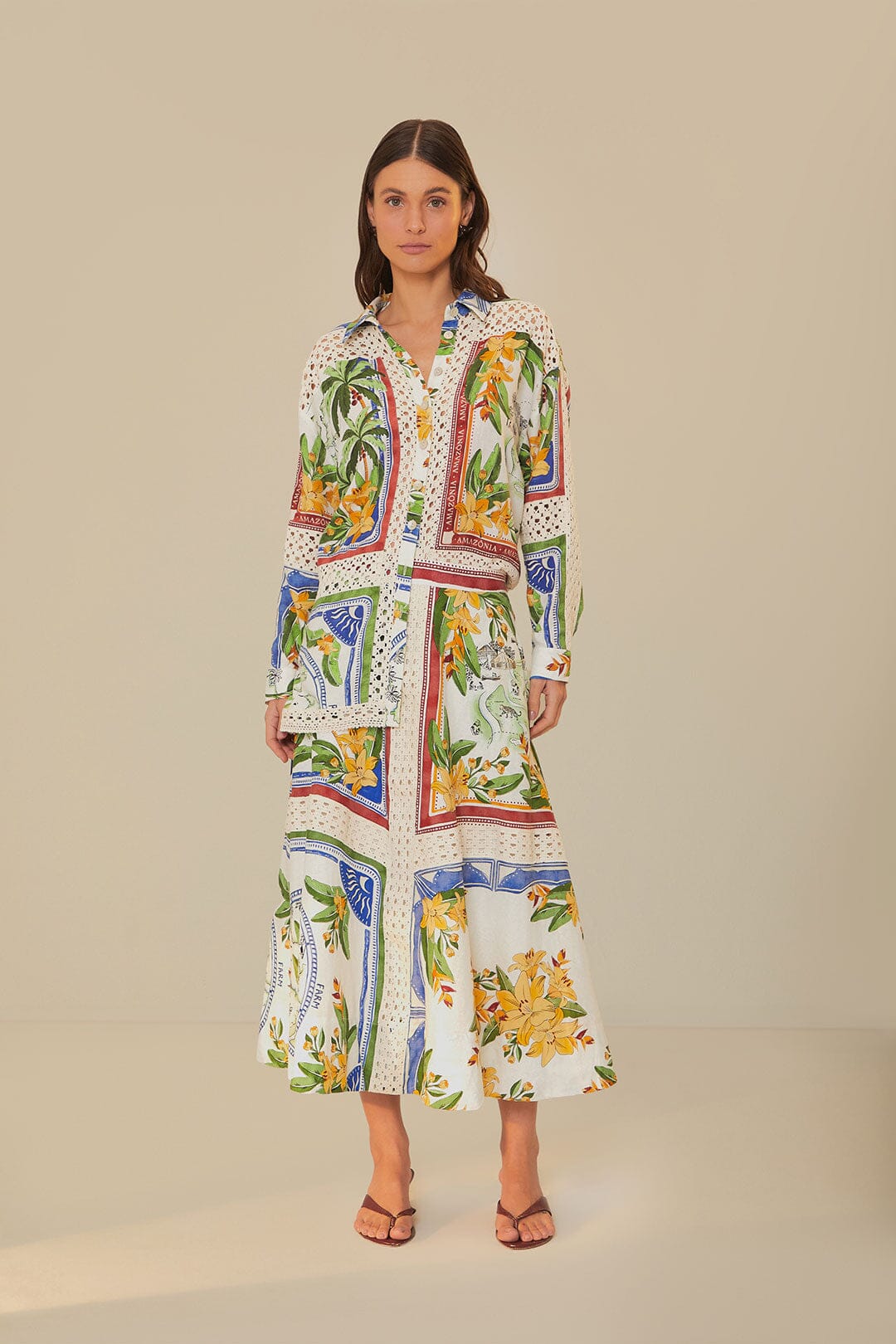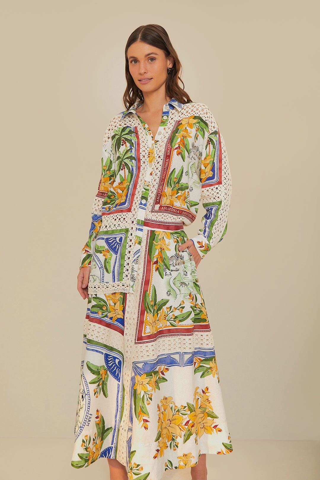 Embrace the vibrance of the tropics with the Off-White Tropical Destination LENZING™ ECOVERO™ Euroflax™ Midi Skirt. This beautifully crafted piece features an intricate, eye-catching mix of lush botanical prints and wildlife motifs, complemented by bold border detailing. Its free-flowing silhouette and delicate eyelet accents throughout add a touch of elegance and movement. Made with materials from responsible sources, this midi skirt invites you to wander in comfort and style while embracing a connection with nature.
